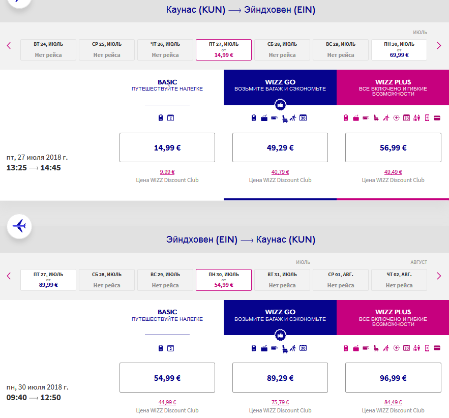Пример бронирования на сайте WizzAir всего за 70 евро туда-обратно: