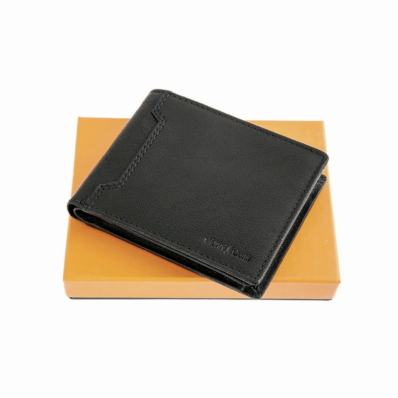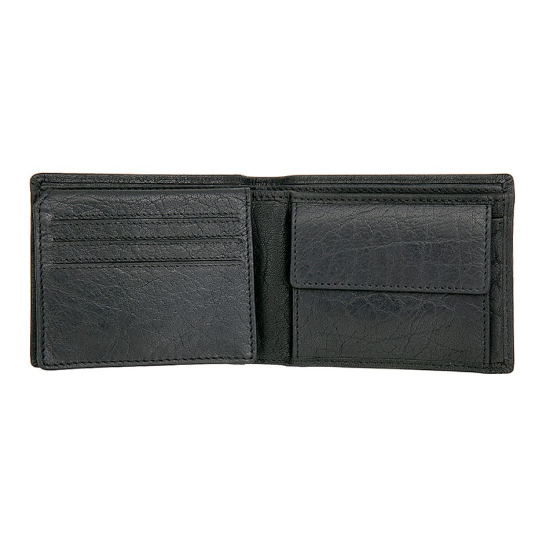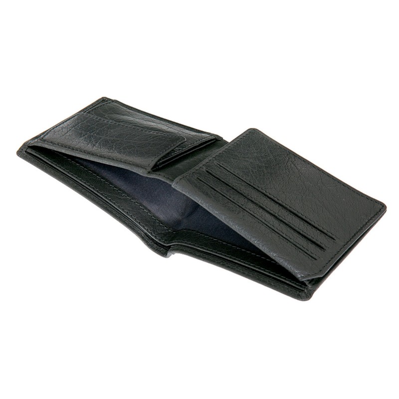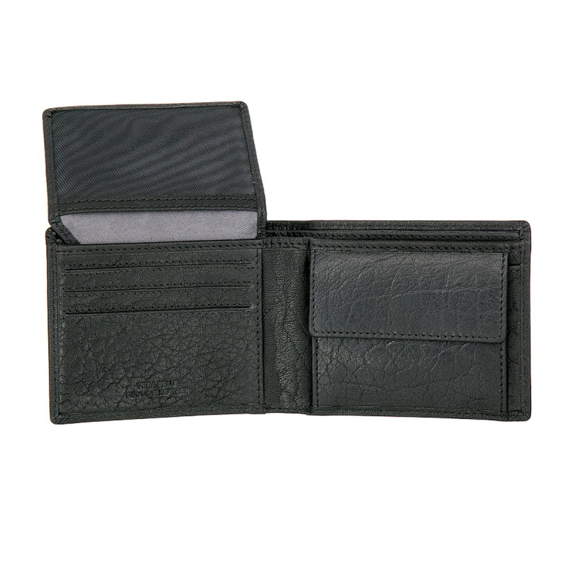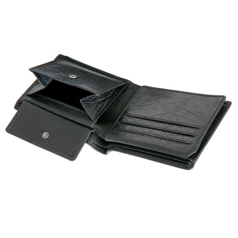 • Портмоне из натуральной кожи. Раскладывается пополам, внутри два отдела для купюр, отделение для монет на кнопке, два потайных кармана, шесть слотов для банковских или дисконтных карт, сетчатый карман. Наличие RFID Protection (защита от считывания данных с банковских карт).