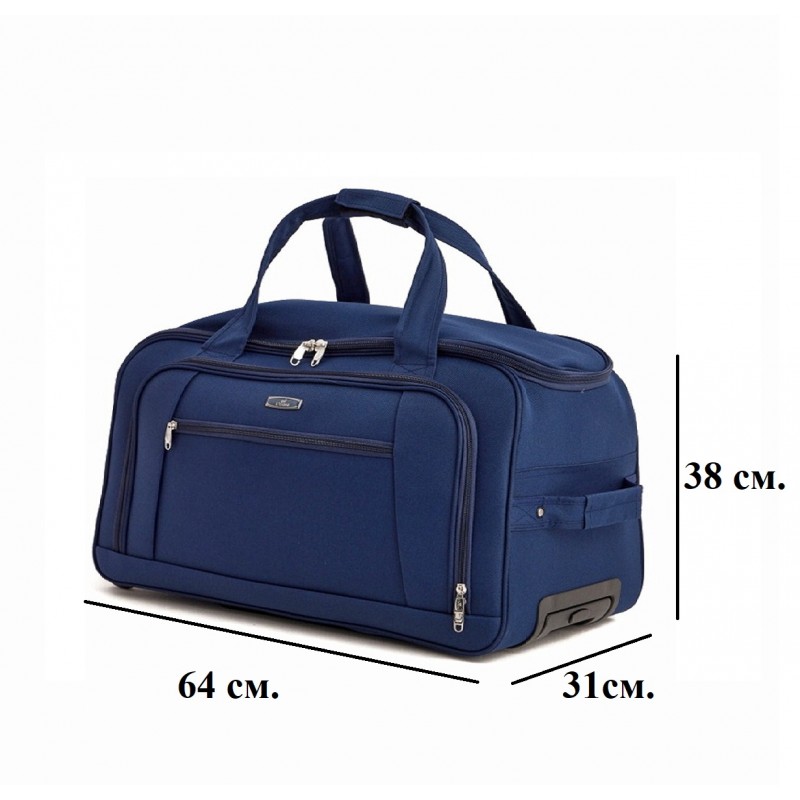 Дорожная сумка на колесах из полиэстера 1200 DEN с выдвижной ручкой, фиксируется в трех положениях. Ручка для переноски сбоку, ручка для переноски сверху (соединяется клапаном на липучке), пластиковая ручка сбоку для переноски двумя руками, служит опорой при вертикальном расположении. Закрывается на двустороннюю молнию шириной 10 мм., комплектуется навесным замком с ключом. Внутри большой отдел для багажа, два кармана для мелочей, снаружи на передней стенке большой отдел на молнии с карманом на молнии. Снаружи дно защищено пластиковыми направляющими, колеса шириной 2,2 см., диаметром 7,2 см., на шарикоподшипниках.