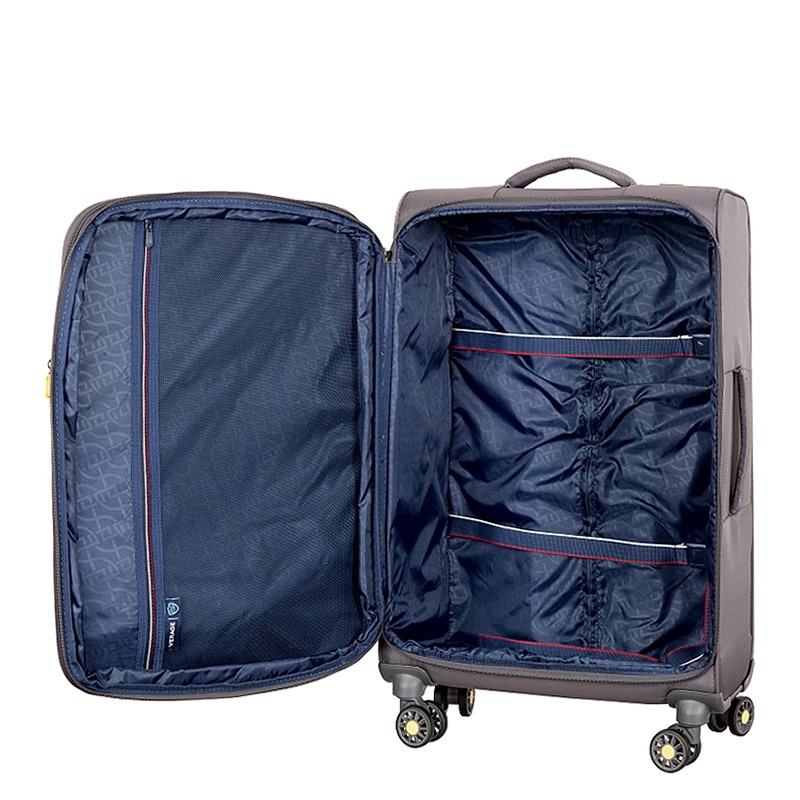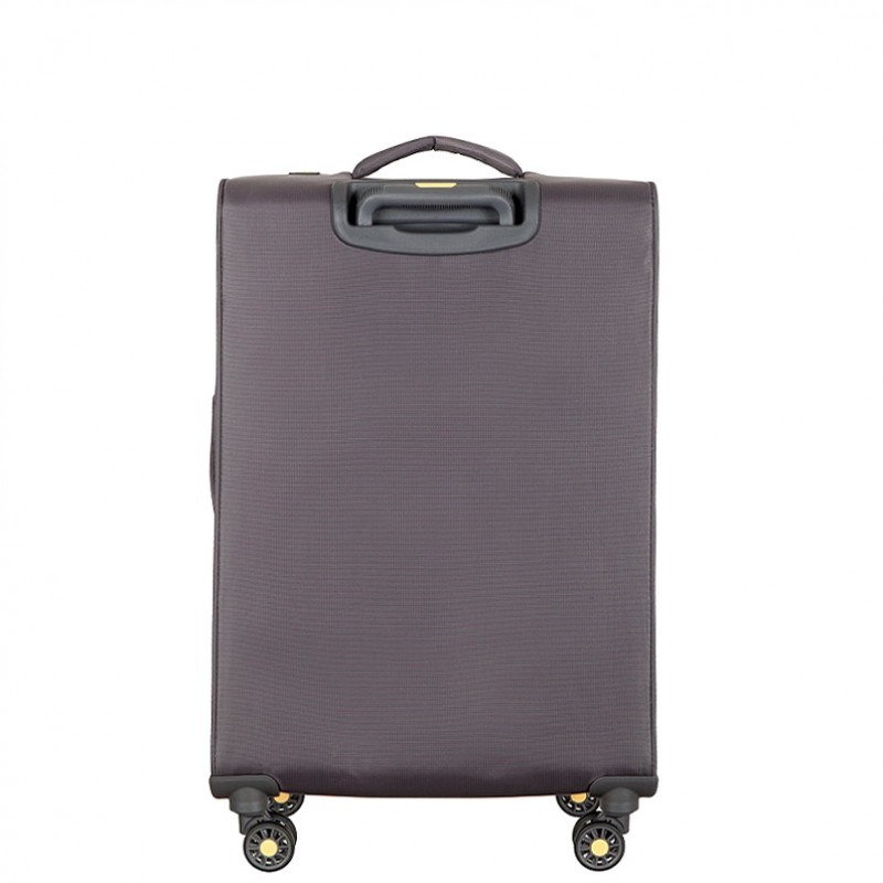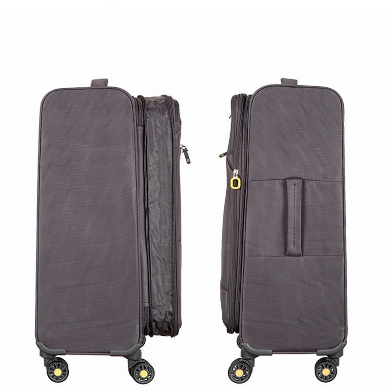 • Двухслойный полиэстер высокой плотности, непромокаемый, телескопическая ручка с ребрами жесткости, фиксируется в трех положениях. В корпусе сверху и снизу специальный каркас жесткости из полипропилена. Увеличение объема: + 15% для багажа.