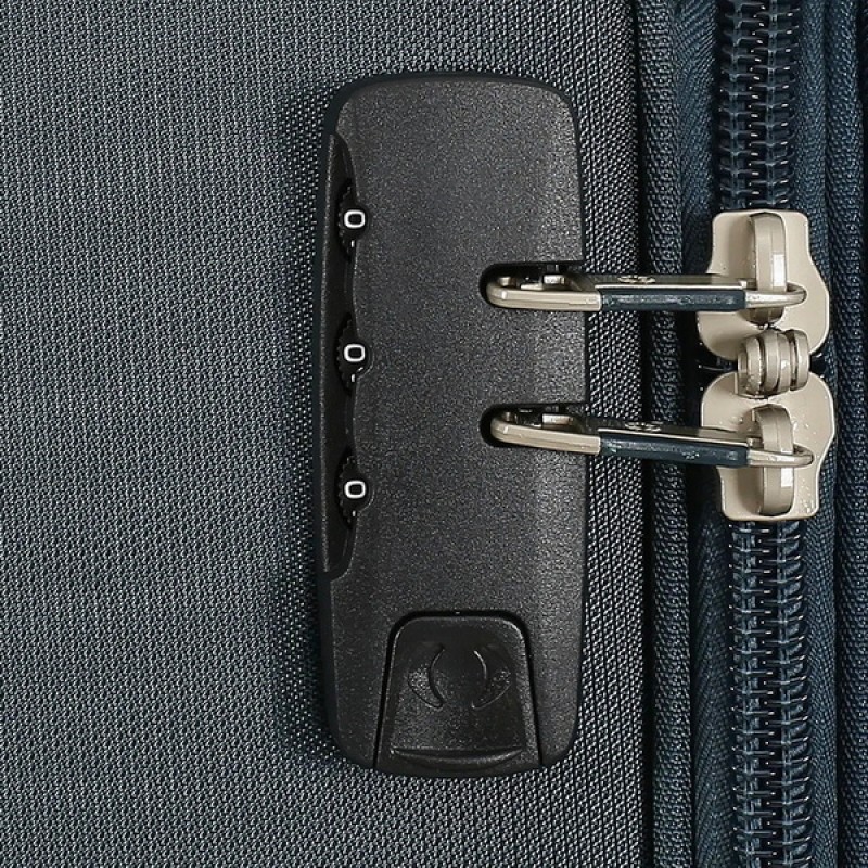 Снаружи карман для мелких предметов и большое отделение защищенное от попадания воды, закрываются нак молнии. На стенке вшитая дорожная бирка. Накладной кодовый замок. Внутри: ремни-фиксаторы, на крышке сетчатое отделение на молнии.