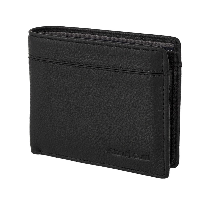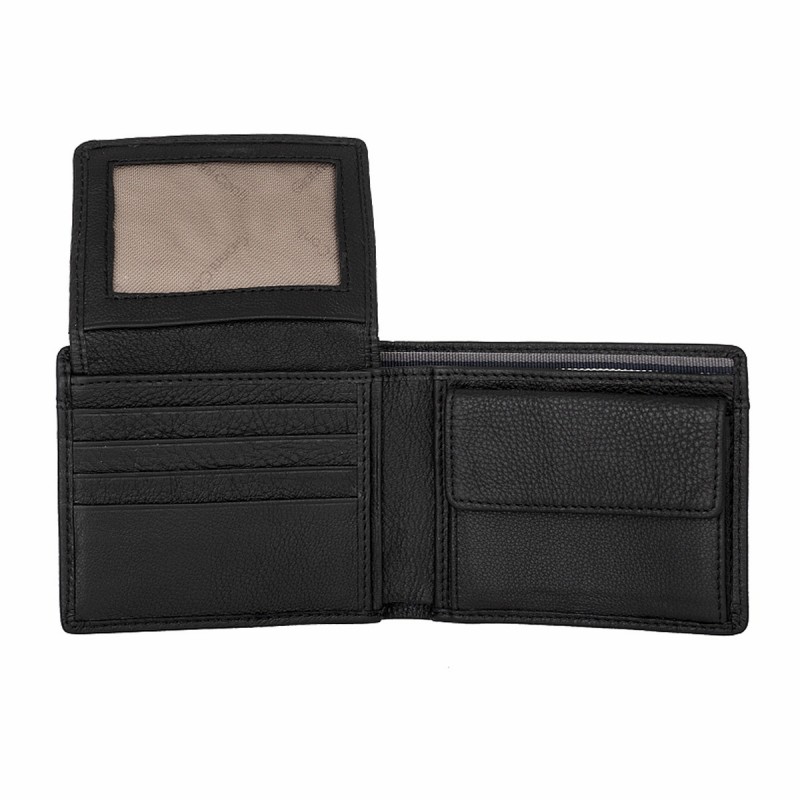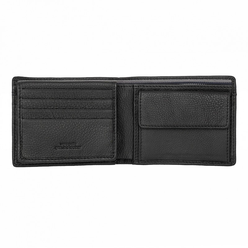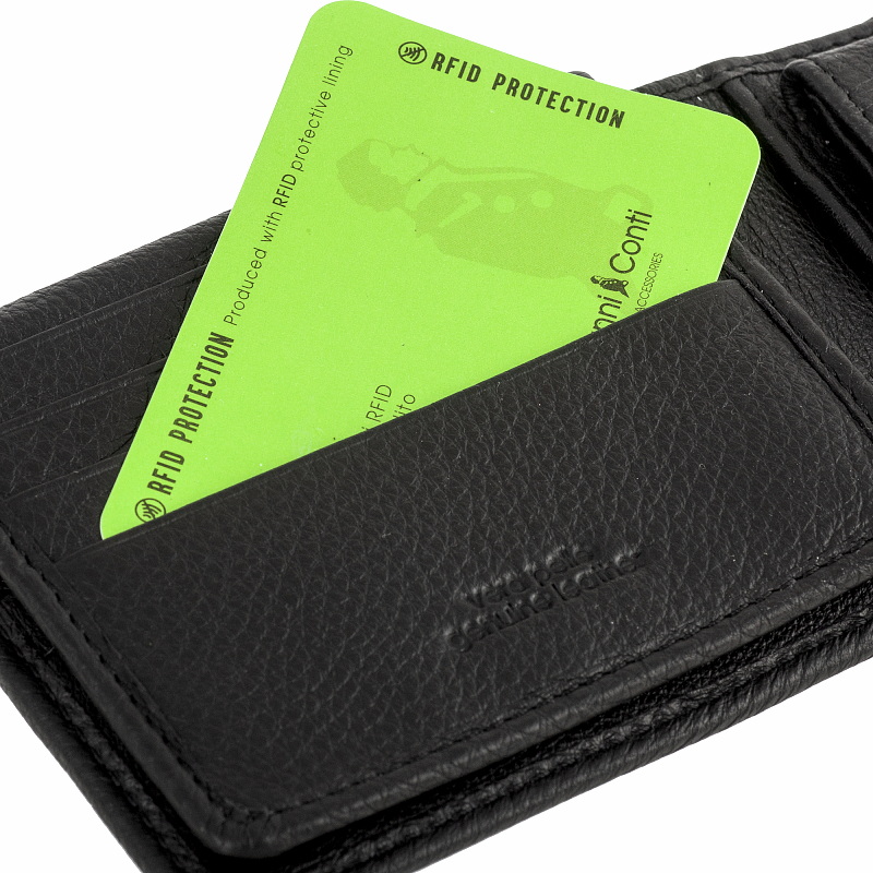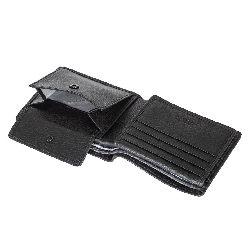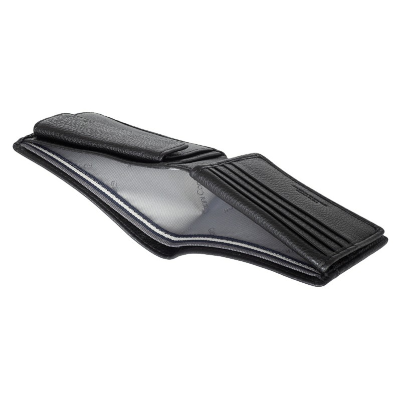 Раскладывается пополам, внутри: два отделения для купюр, карман для монет на кнопке, три потайных отдела, восемь отделений для банковских или дисконтных карт, сетчатый карман. Наличие RFID Protection (защита от считывания данных с банковских карт).