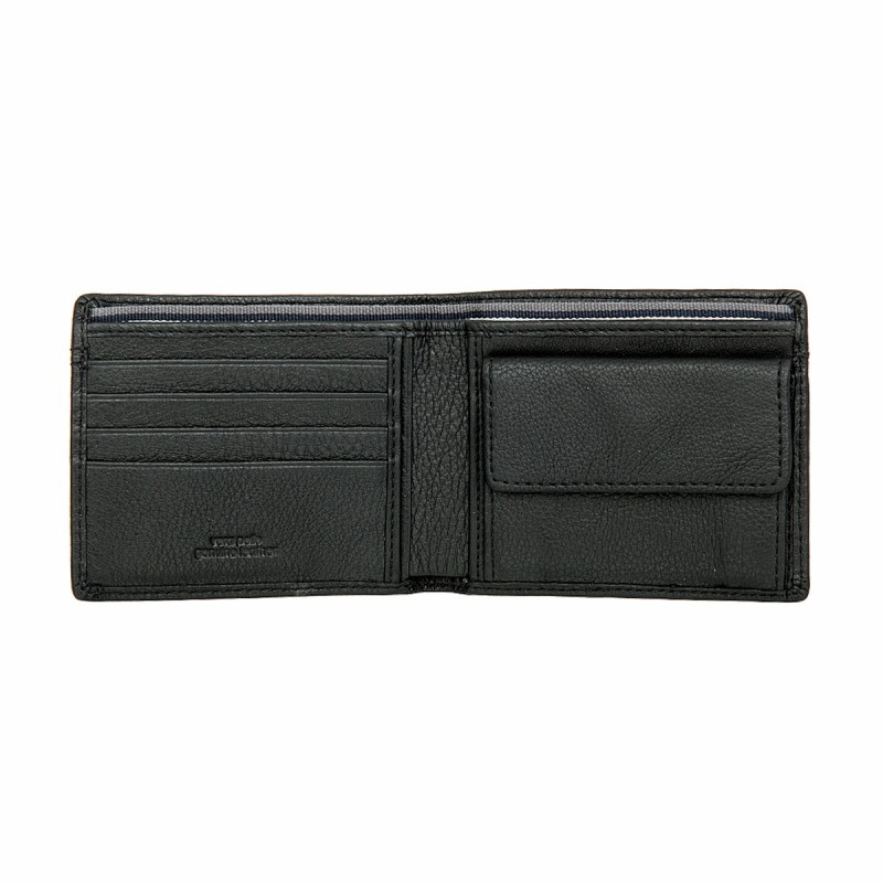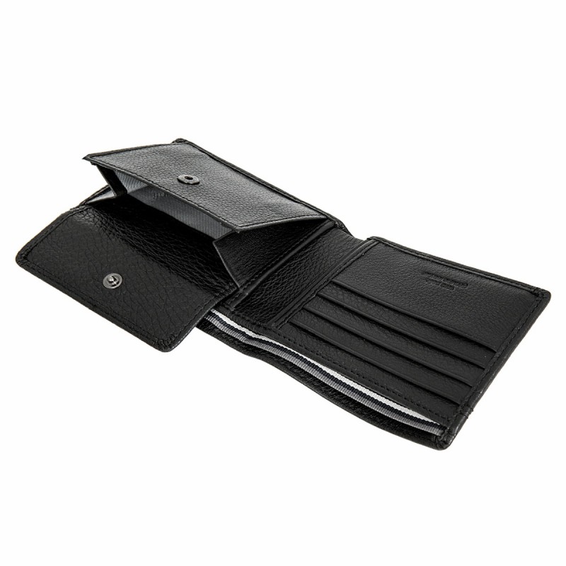Раскладывается пополам, внутри: два отделения для купюр, карман для монет на кнопке, три потайных отдела, восемь отделений для банковских или дисконтных карт, сетчатый карман. Наличие RFID Protection (защита от считывания данных с банковских карт).