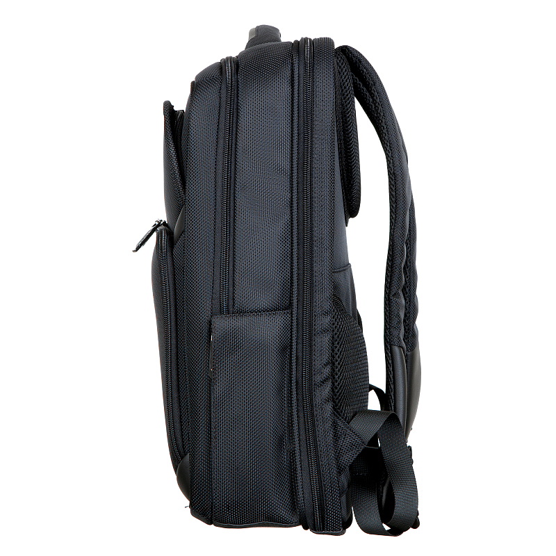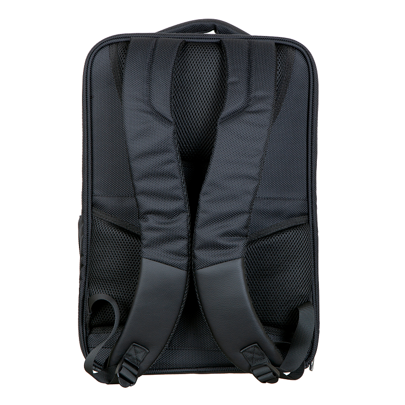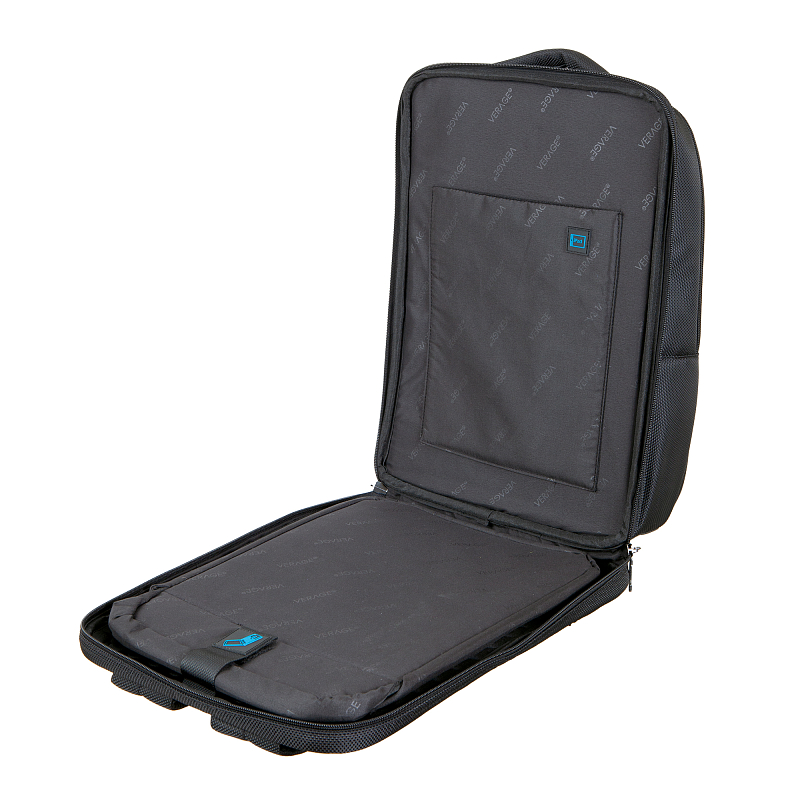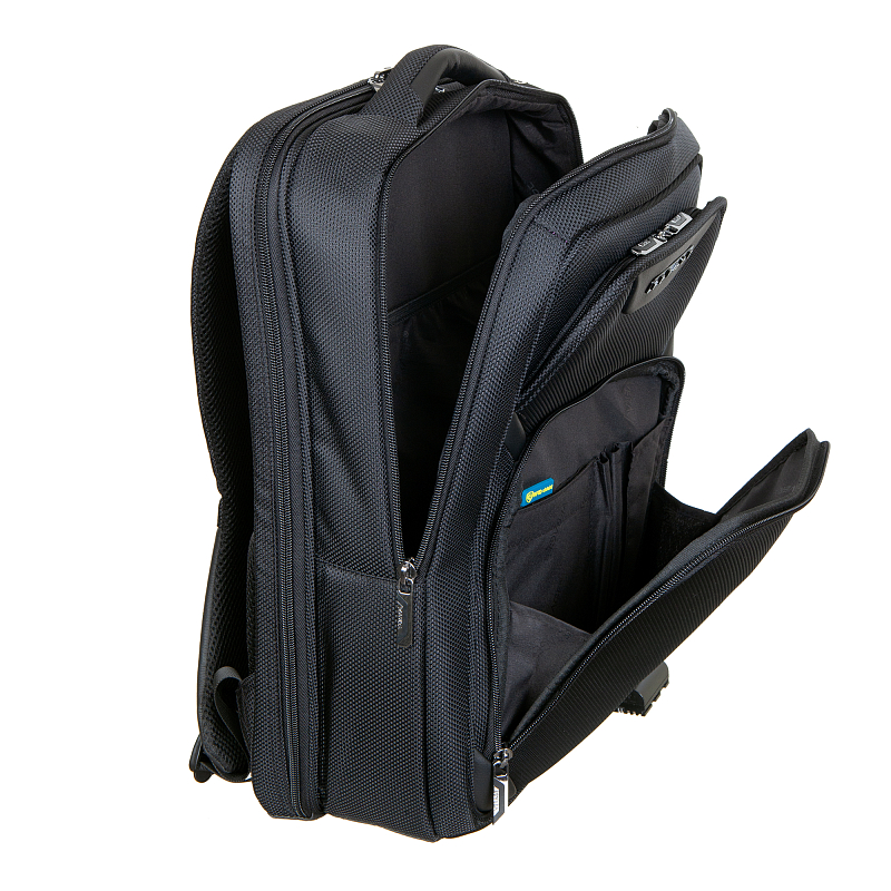 Состоит из двух независимых отделений на молниях. В главном сетчатый карман на молнии и карман для мелких предметов. Во втором отделе мягкий отдел для планшета и защищенный отдел для ноутбука (мах.15.6”) на липучке. На лицевой стороне два отдела на молниях, внутри: карман для мелких предметов, два держателя для авторучек и съёмное кольцо для ключей, отдел на липучке с функцией RFID shield (защита от считывания данных с банковских карт). На внутренней стороне потайной карман на молнии, клапан для крепления на ручку чемодана. Сбоку карман на молнии с увеличением, для бутылки воды или зонта. Дно рюкзака покрыто специальной защитой от царапин.