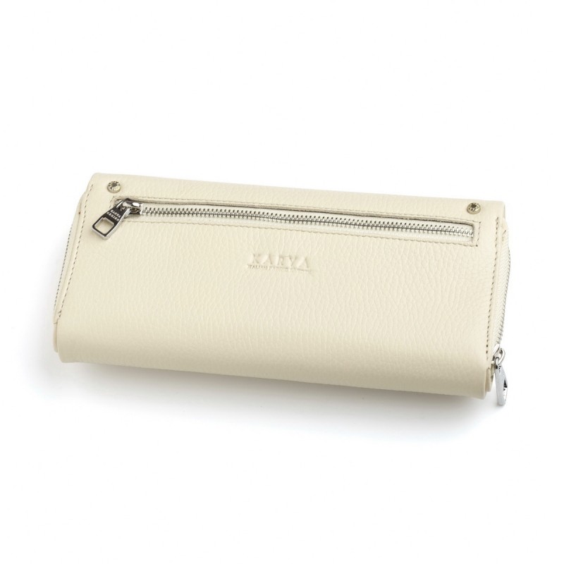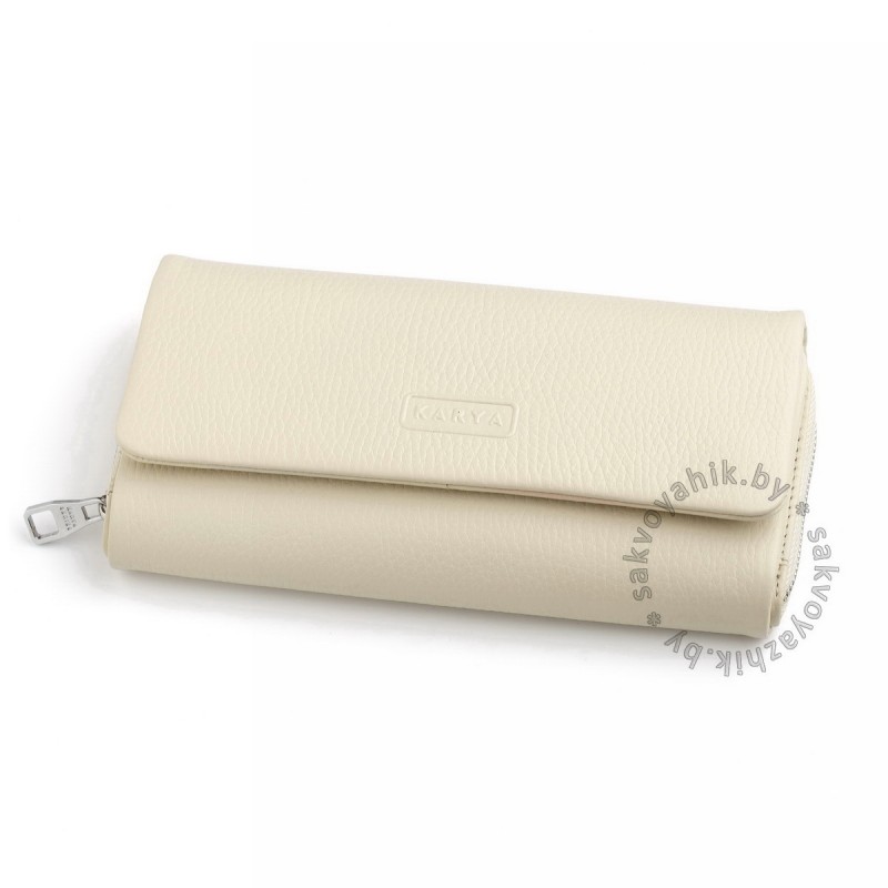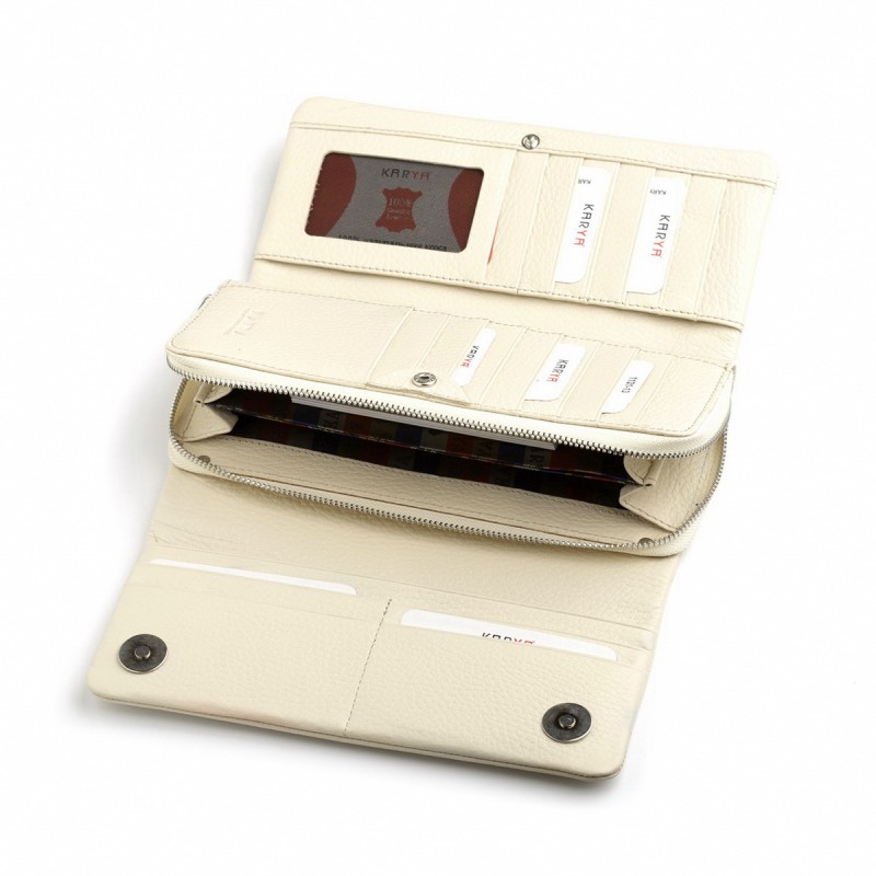 • Кошелек из мягкой натуральной кожи светло-кремового цвета, закрывается клапаном на двух магнитах. Внутри: отдел на молнии с 3-мя отделениями для купюр, 3 больших отдела, 19 отделений для банковских или дисконтных карт, 1 потайное отделение для документов. Снаружи, отдел для монет на молнии. Упаковано в подарочную коробку с логотипом Karya.