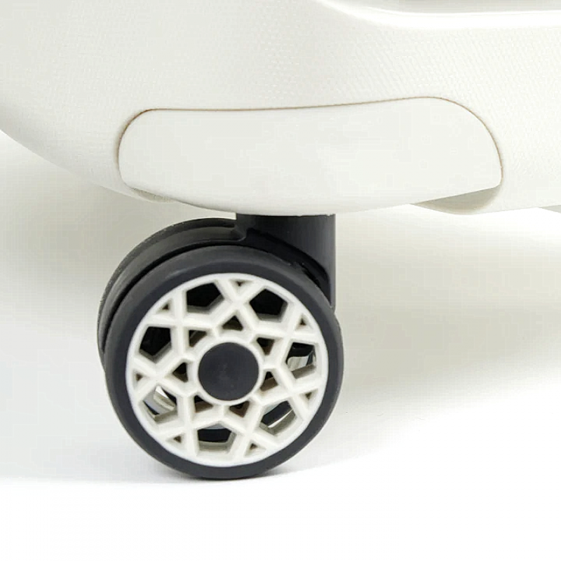 Телескопическая система – с ребрами жесткости, фиксируется в трех положениях, ручки для переноски с эффектом противоскольжения. В нижней части корпуса литые, противоскользящие ручки для переноски чемодана двумя руками. 4 двойных, усиленных колеса с покрытием из термополиуретана. Опорные ножки изготовлены в виде крючков для размещения небольших сумок.