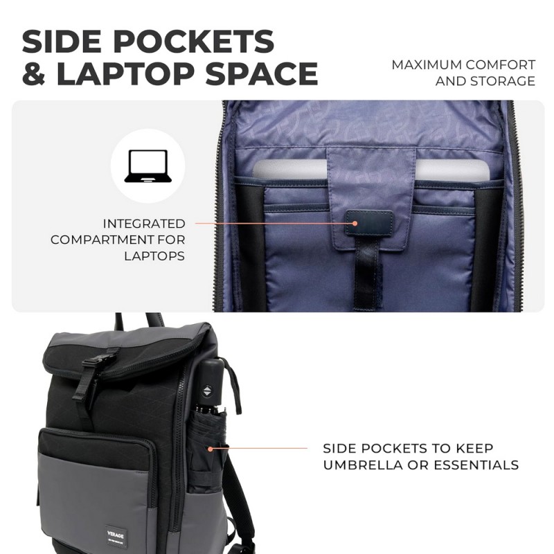 В основном отделе 2 мягких отдела для планшета или ноутбука,фиксируются на липучку, эластичные карманы для ТЛФ, авторучек, и.т. п. На лицевой стороне два вместительных кармана на молниях, с обратной стороны потайной карман на молнии. Рюкзак оснащён верхней ручкой для переноски, эргономичными регулируемыми лямками, клапан для крепления на ручку чемодана, спинка с мягкими подушками системы Airstripes. По бокам кармана с увеличением, для емкостей с жидкостью, зонта, и.т.п.