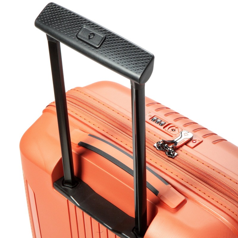 Телескопическая система – с ребрами жесткости, фиксируется в трех положениях, ручки для переноски с эффектом противоскольжения. В нижней части корпуса литые, противоскользящие ручки для переноски чемодана двумя руками. 4 двойных, усиленных колеса с покрытием из термополиуретана. Опорные ножки изготовлены в виде крючков для размещения небольших сумок.