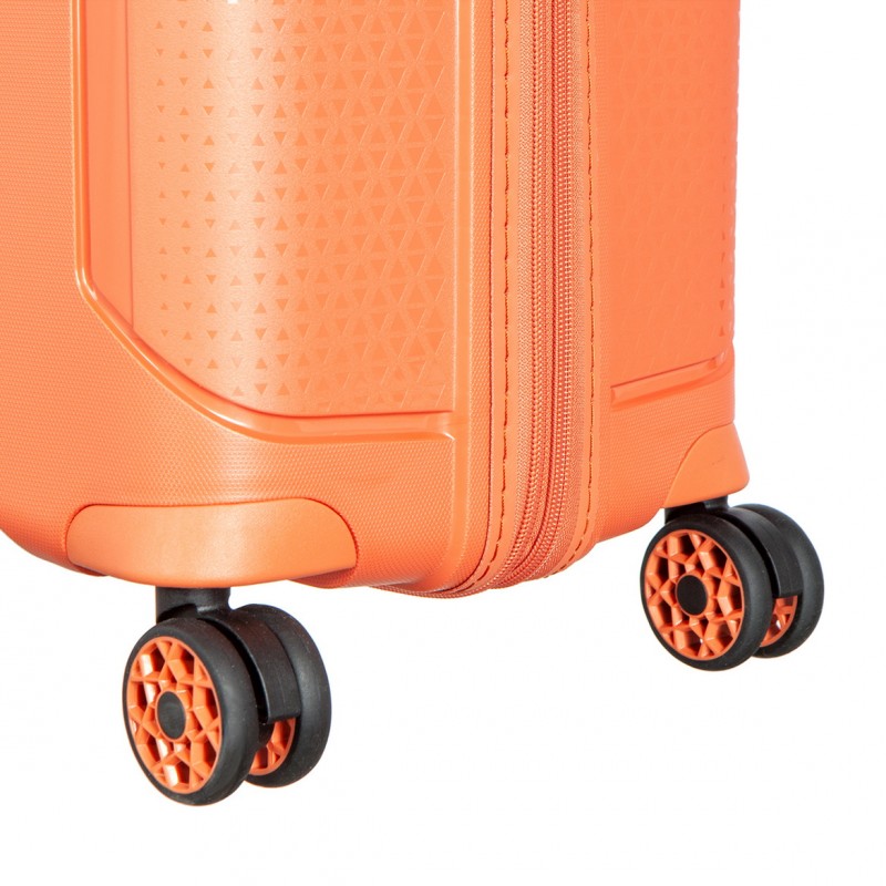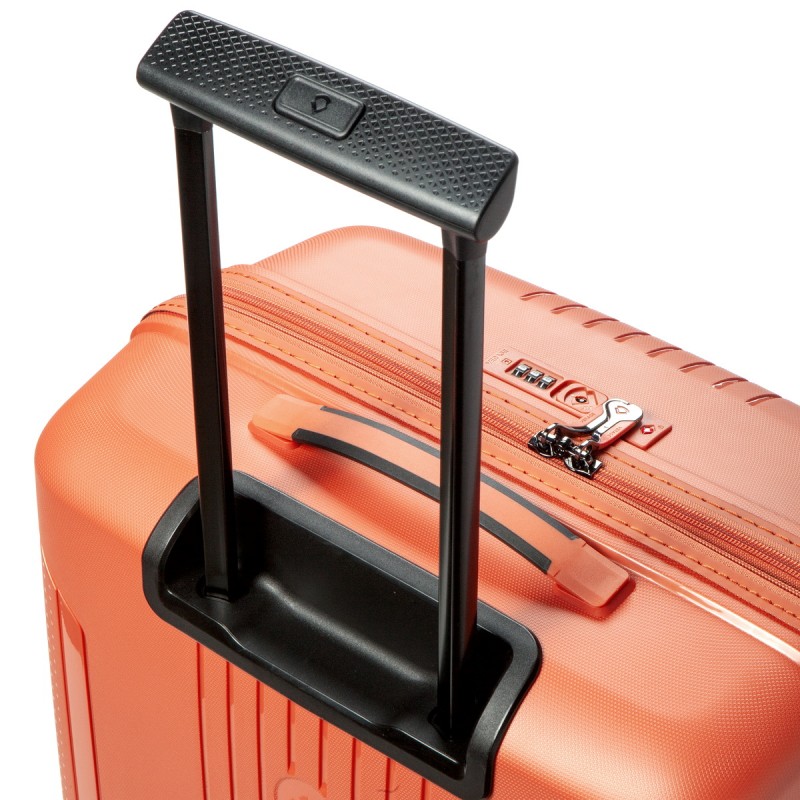 Телескопическая система – с ребрами жесткости, фиксируется в трех положениях, ручки для переноски с эффектом противоскольжения. В нижней части корпуса литые, противоскользящие ручки для переноски чемодана двумя руками. 4 двойных, усиленных колеса с покрытием из термополиуретана. Опорные ножки изготовлены в виде крючков для размещения небольших сумок.