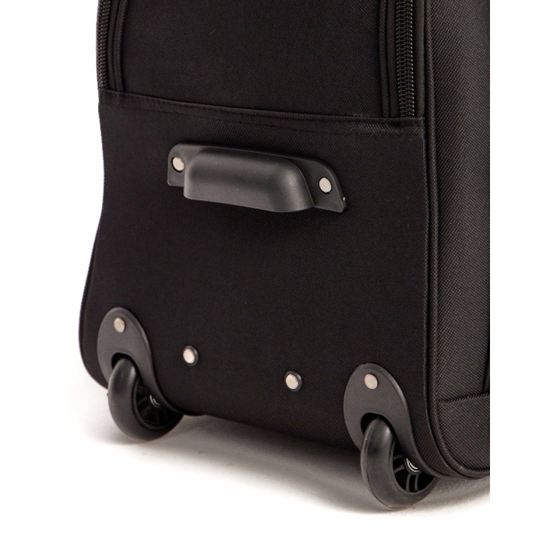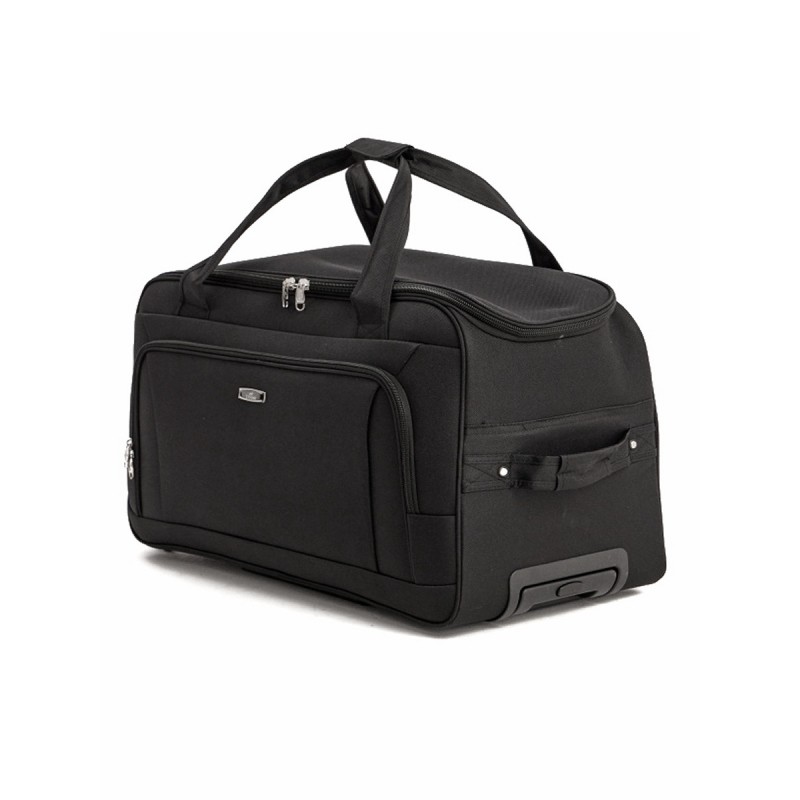 Дорожная сумка на колесах из полиэстера 1200 DEN с выдвижной ручкой, фиксируется в трех положениях. Ручка для переноски сбоку, ручка для переноски сверху (соединяется клапаном на липучке), пластиковая ручка сбоку для переноски двумя руками, служит опорой при вертикальном расположении. Закрывается на двустороннюю молнию шириной 10 мм., комплектуется навесным замком с ключом. Внутри большой отдел для багажа, два кармана для мелочей, снаружи на передней стенке большой отдел на молнии. Снаружи дно защищено пластиковыми направляющими, колеса шириной 2,2 см., диаметром 7,2 см., на шарикоподшипниках.