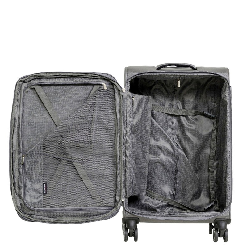 Внутри: в основном отделении ремни-фиксаторы, косметичка на молнии, на крышке сетчатый клапан-перегородка, закрывается на двухстороннюю молнию, с дополнительными резинками-фиксаторами (удобно для быстрого доступа к багажу первой необходимости).