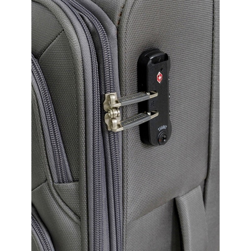 Четыре двойных высокоманевренных колеса с покрытием из полиуретана, накладной оригинальный кодовый замок TSA-007. Защита верхних углов и нижней части от потертостей, вшитая адресная бирка, возможность увеличения объема на 15%.