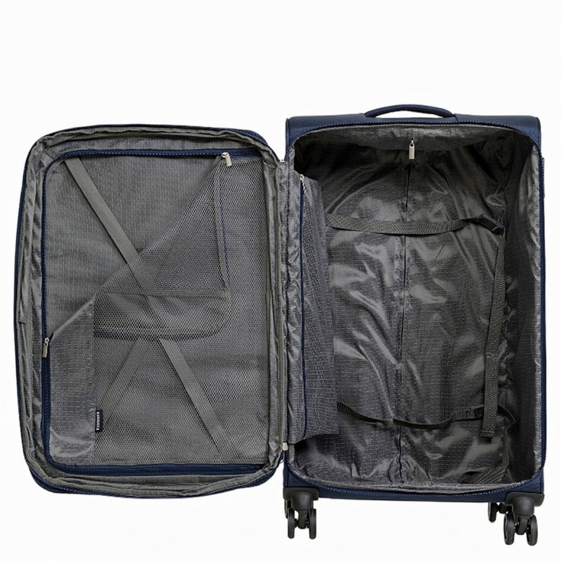 • Внутри: в основном отделении ремни-фиксаторы, косметичка на молнии, на крышке сетчатый клапан-перегородка, закрывается на двухстороннюю молнию, с дополнительными резинками-фиксаторами (удобно для быстрого доступа к багажу первой необходимости).