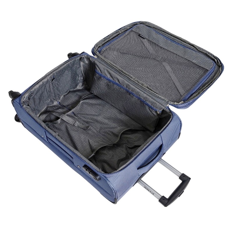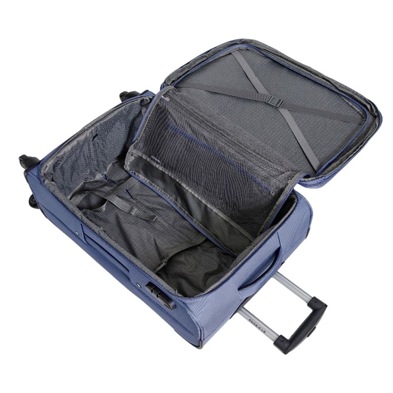 • Внутри: в основном отделении ремни-фиксаторы, косметичка на молнии, на крышке сетчатый клапан-перегородка, закрывается на двухстороннюю молнию, с дополнительными резинками-фиксаторами (удобно для быстрого доступа к багажу первой необходимости).