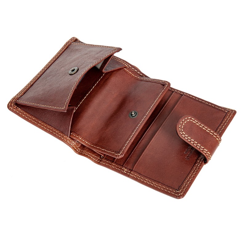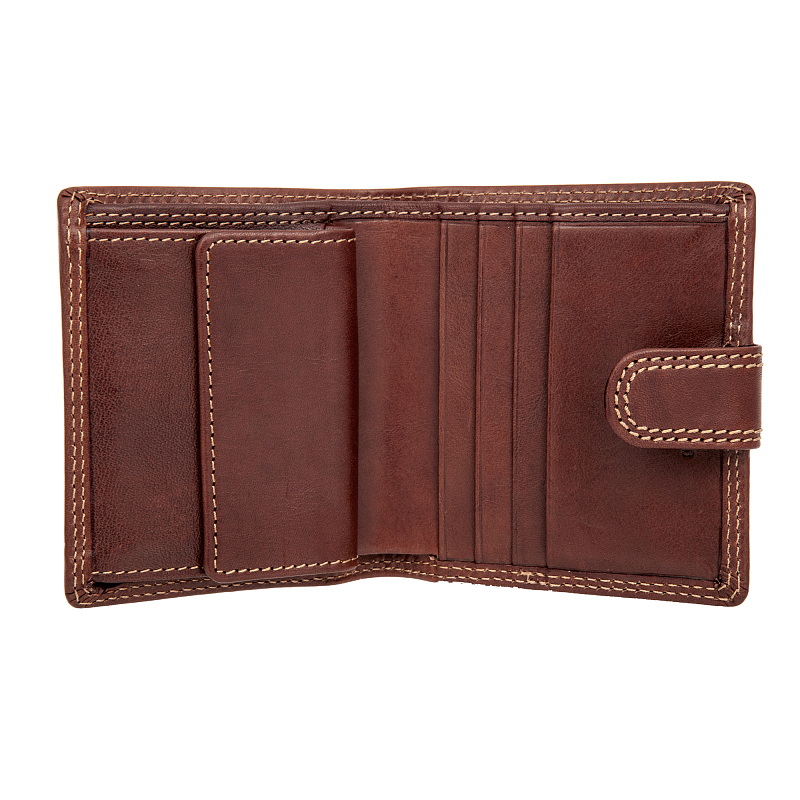 Компактный кошелек унисекс. Закрывается клапаном на кнопке, внутри два отдела для купюр, отделение для монет на кнопке, потайной карман, четыре отделения для банковских или дисконтных карт.