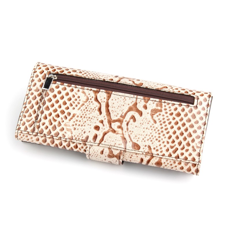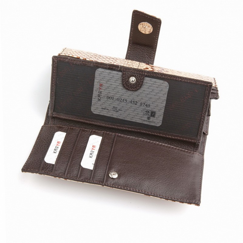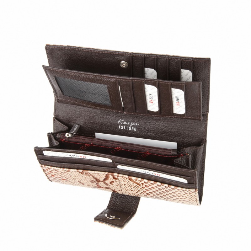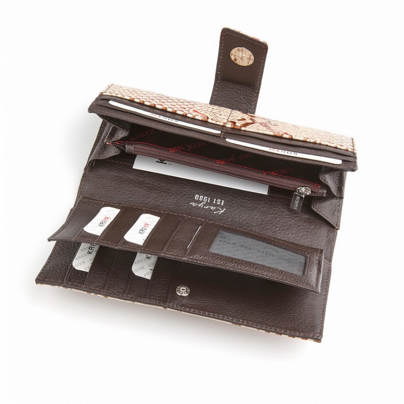 Основной отдел закрывается клапаном на кнопку магнит. Внутри: 3 отделения для купюр, 1 отдел для монет на молнии, 12 отделений (одно сетчатое) для банковских или дисконтных карт, дополнительный отдел – 6 отделений для банковских карт, потайной карман, большой сетчатый карман. Снаружи, с обратной стороны отдел на молнии. Упаковано в подарочную коробку и фирменный пакет Karya.