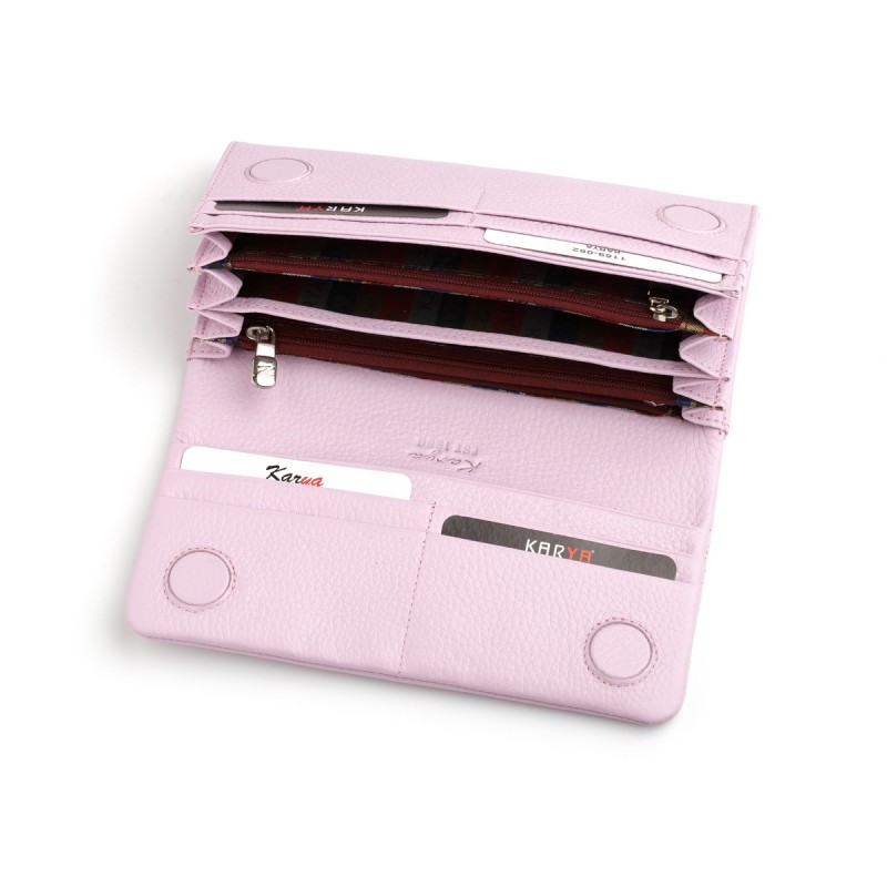 • Кошелек из мягкой натуральной кожи, закрывается клапаном на двух магнитах. Внутри: 5 отделений для купюр, 3 отдела на молниях, 8 отделений для банковских или дисконтных карт, потайное отделение для документов. Снаружи отдел для монет на молнии. Упаковано в подарочную коробку с логотипом Karya.