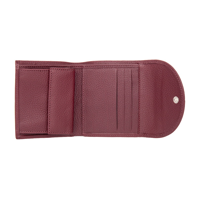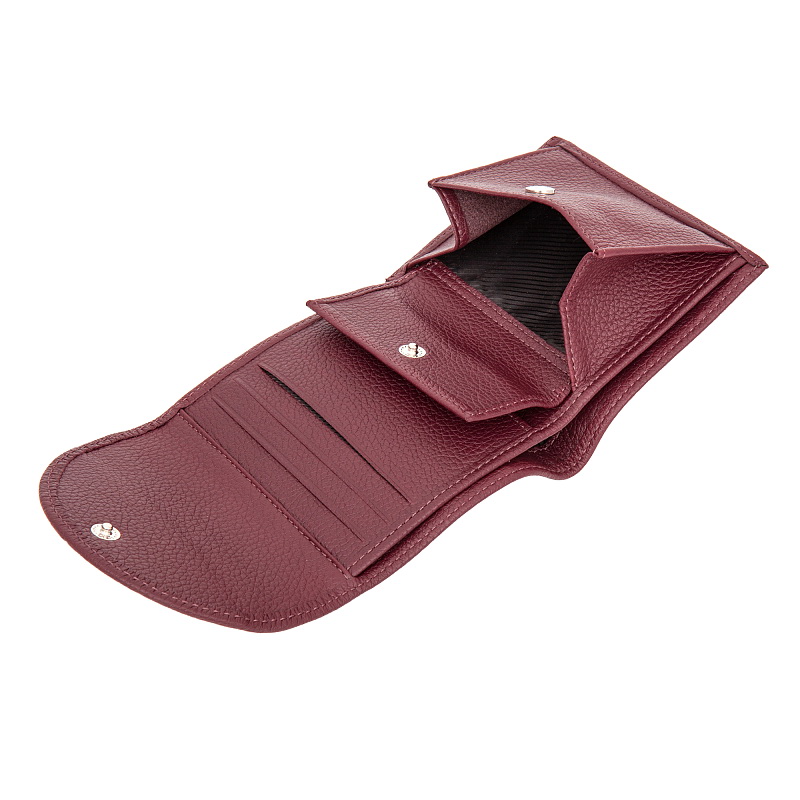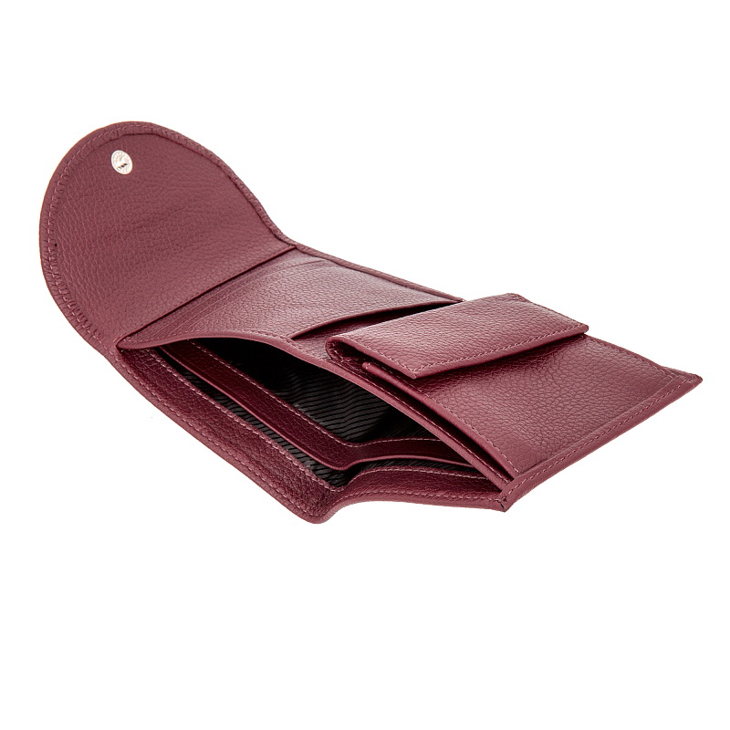 • Закрывается клапаном на кнопку. Внутри два отделения для купюр, один потайной карман, три отдела для банковских или дисконтных карт, отделение для монет на кнопке.