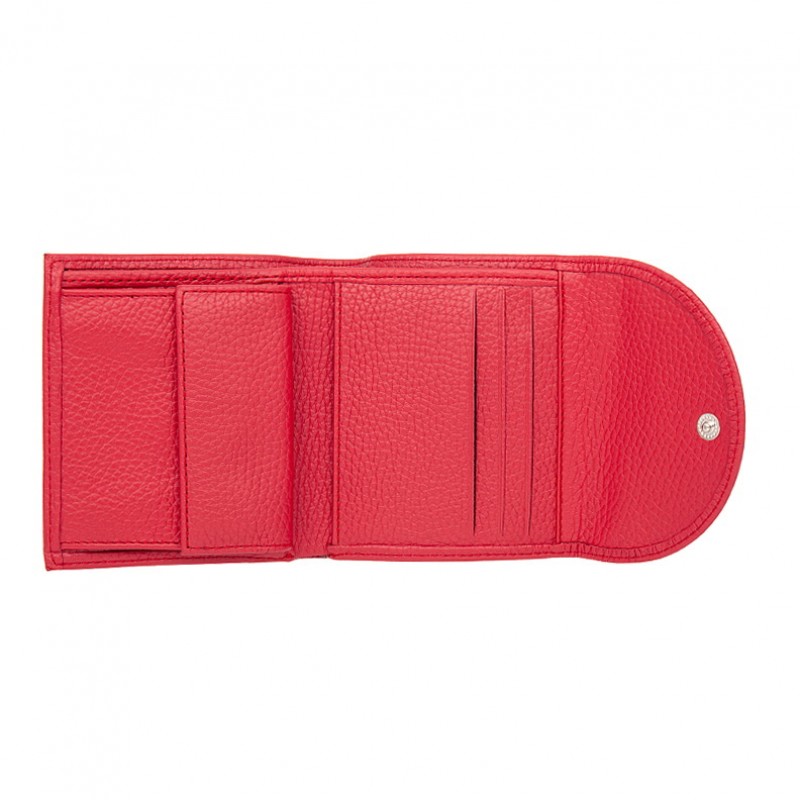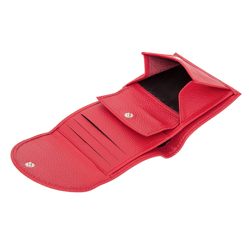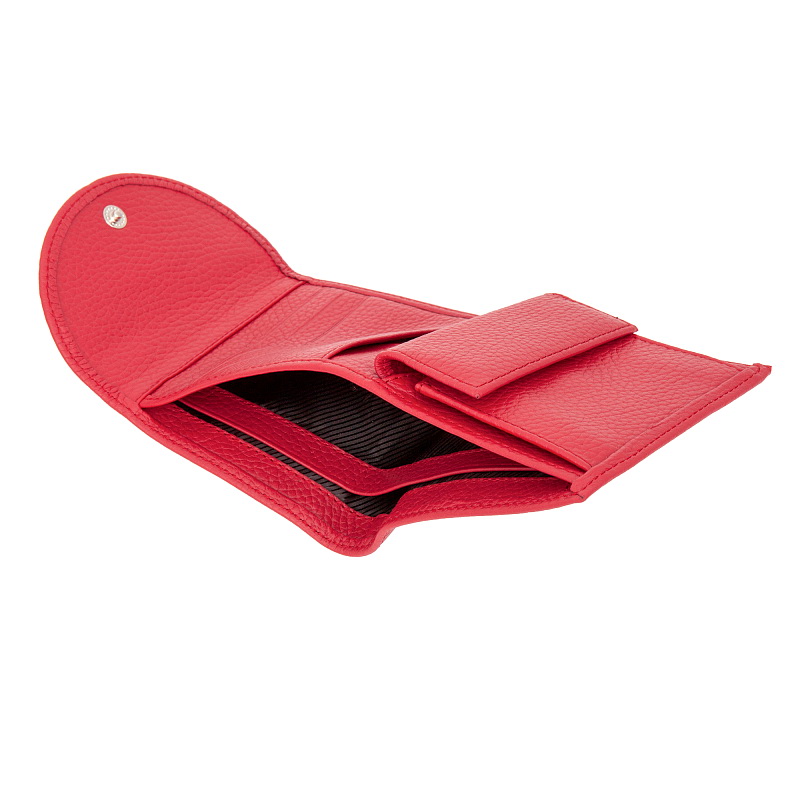 • Закрывается клапаном на кнопку. Внутри два отделения для купюр, один потайной карман, три отдела для банковских или дисконтных карт, отделение для монет на кнопке.