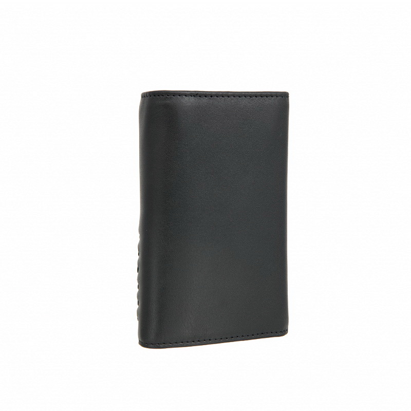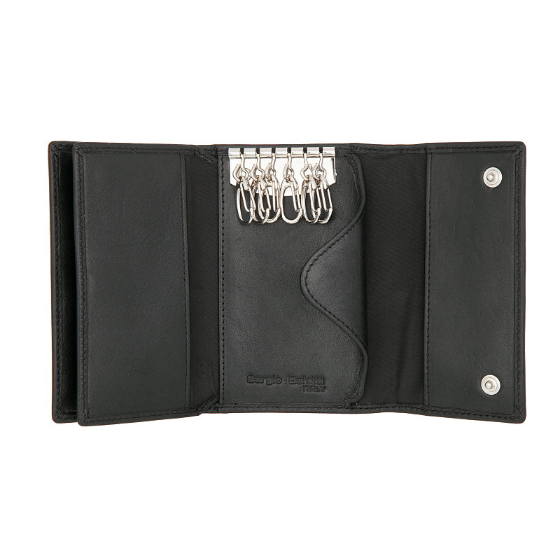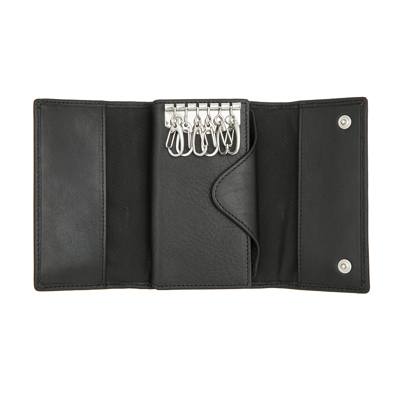 • Футляр из натуральной гладкой кожи. Модель с двумя уровнями карабинов для ключей разделенных клапаном на кнопке, закрывается в три сложения на кнопку. Внутри расположены 12 карабинов (2 по 6) для ключей, потайной карман.
