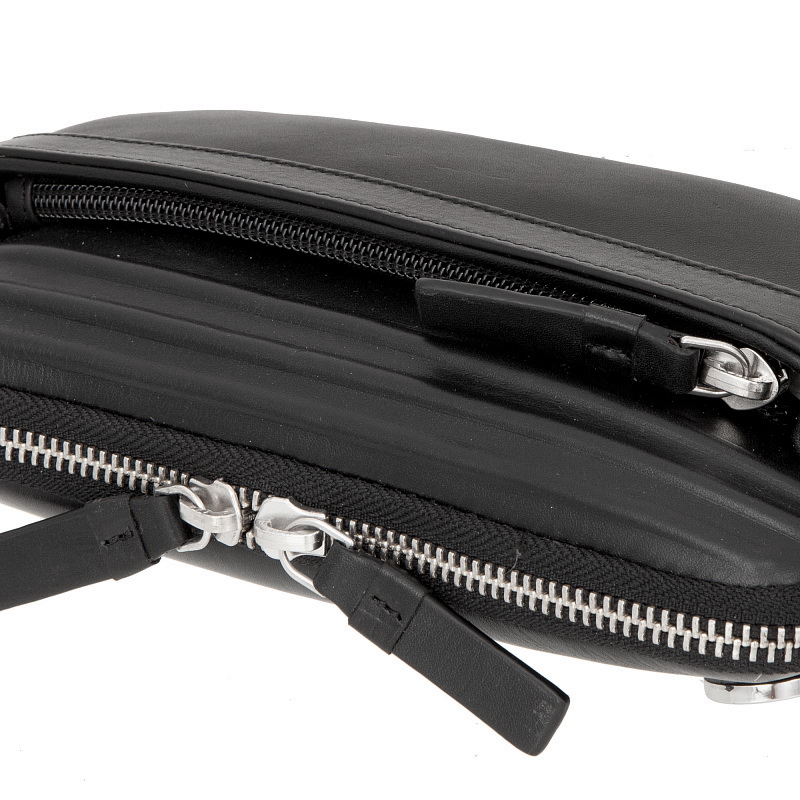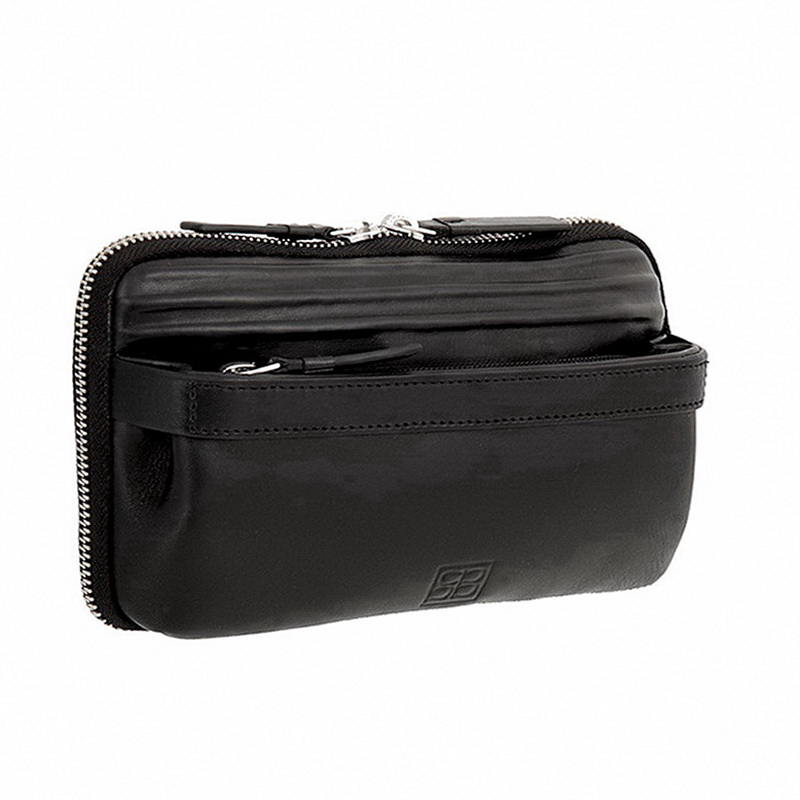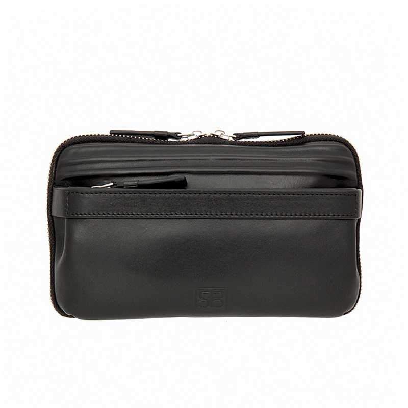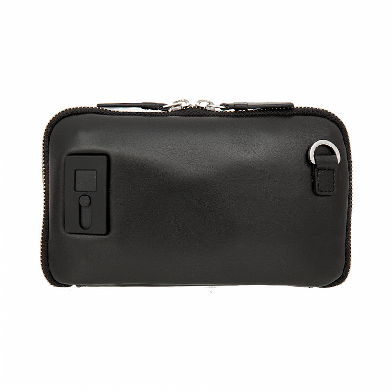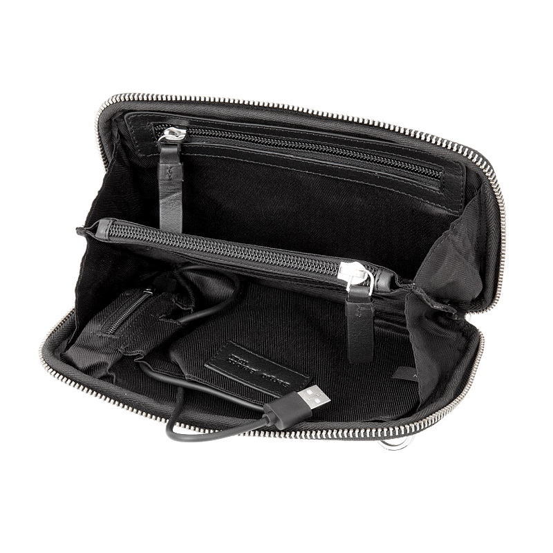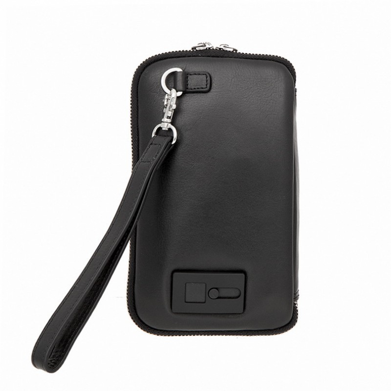 • Мужской чёрный кожаный клатч на молнии. Внутри два продольных отделения, карман на молнии, четыре кармашка для пластиковых карт и один потайной карман. Наличие выхода USB позволит заряжать смартфон. Внутренний кабель USB входит в комплект. На лицевой стенке карман на молнии. Модель оснащена съёмным ремнём на запястье