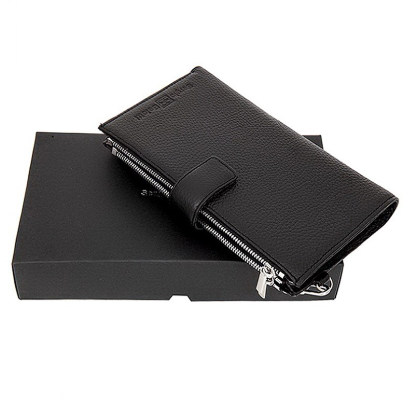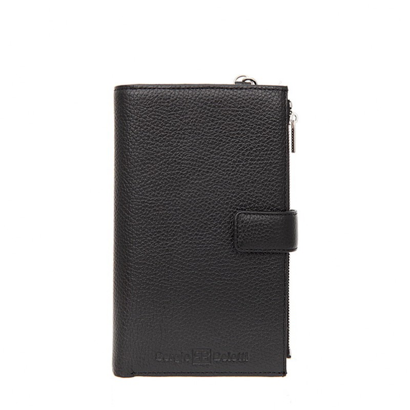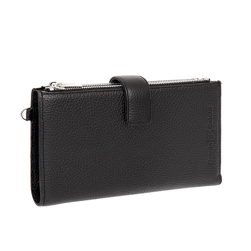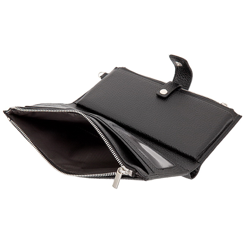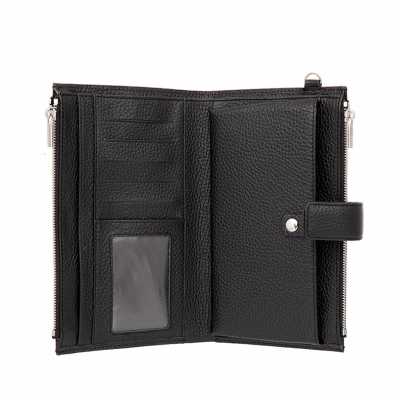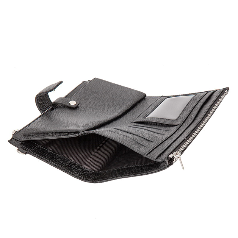 • Внутри два продольных кармана на молниях, два отделение для купюр, отдел для мобильного телефона на кнопке, отдел для документов, шесть слотов для банковских или дисконтных карт. Раскладывается пополам, закрывается хлястиком на кнопке, в комплекте съёмный ремешок на запястье.
