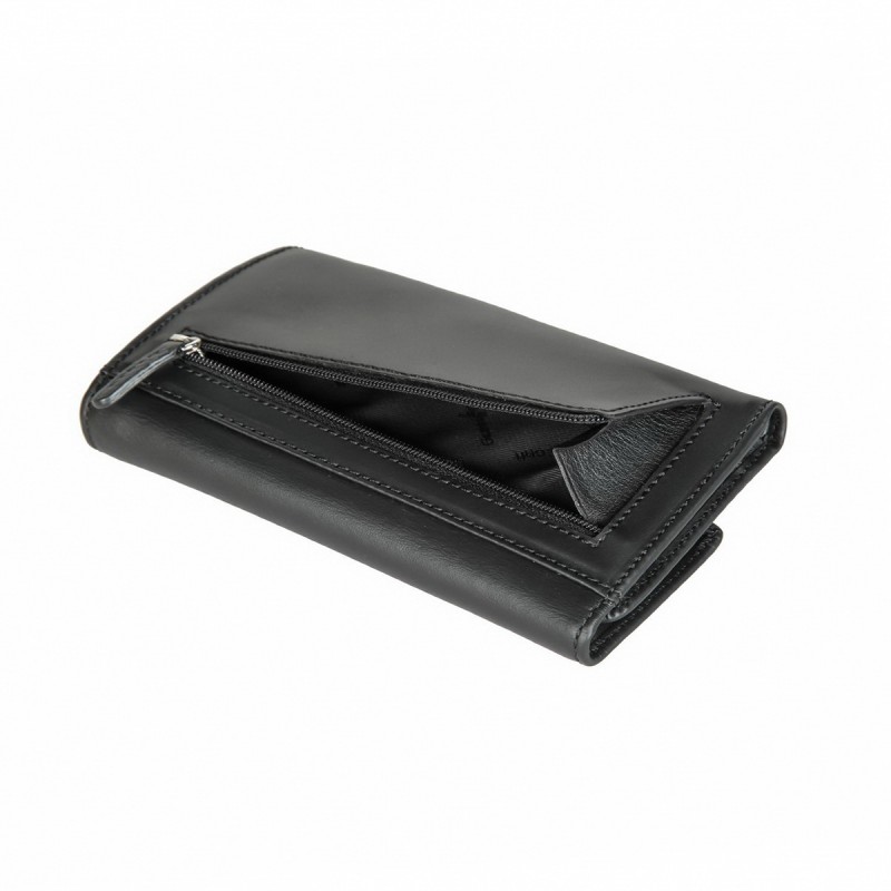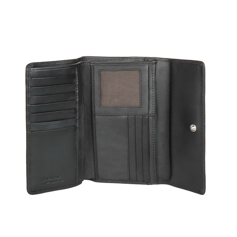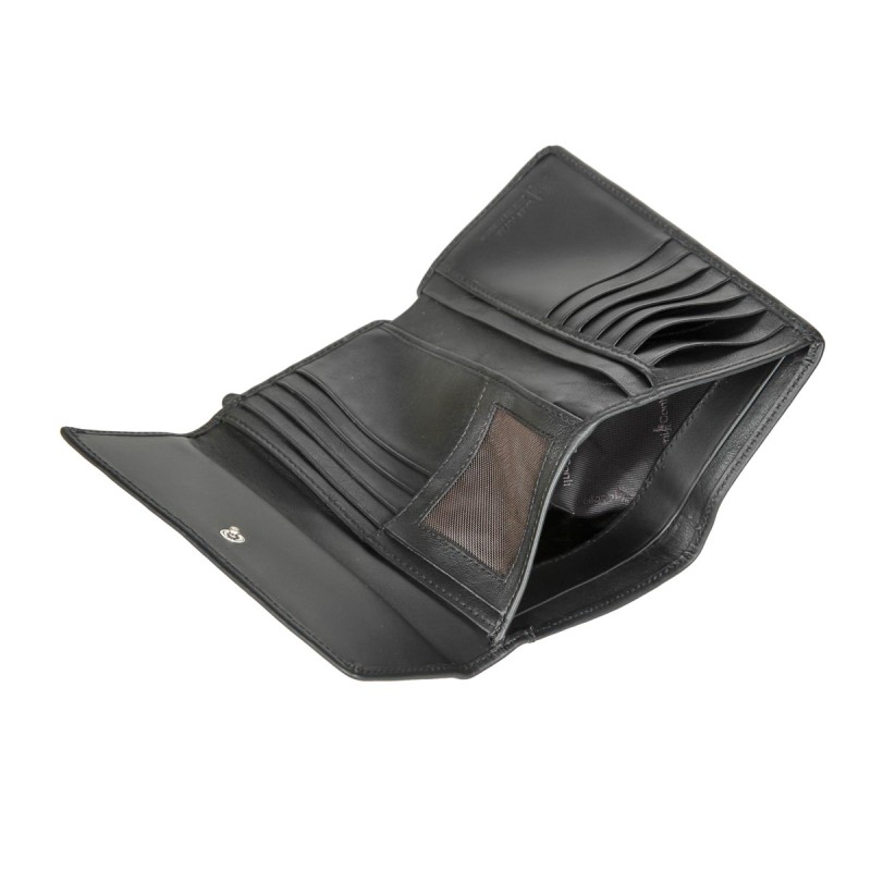 • Закрывается клапаном на двойную кнопку (удобно при разном заполнении кошелька). Внутри: три отдела для купюр, двойной потайной карман, двойной боковой карман для документов, одиннадцать слотов для банковских или дисконтных карт, сетчатый кармашек, снаружи на задней стенке отделение для монет на молнииНаличие RFID Protection (защита от считывания данных с банковских карт).