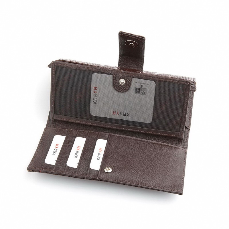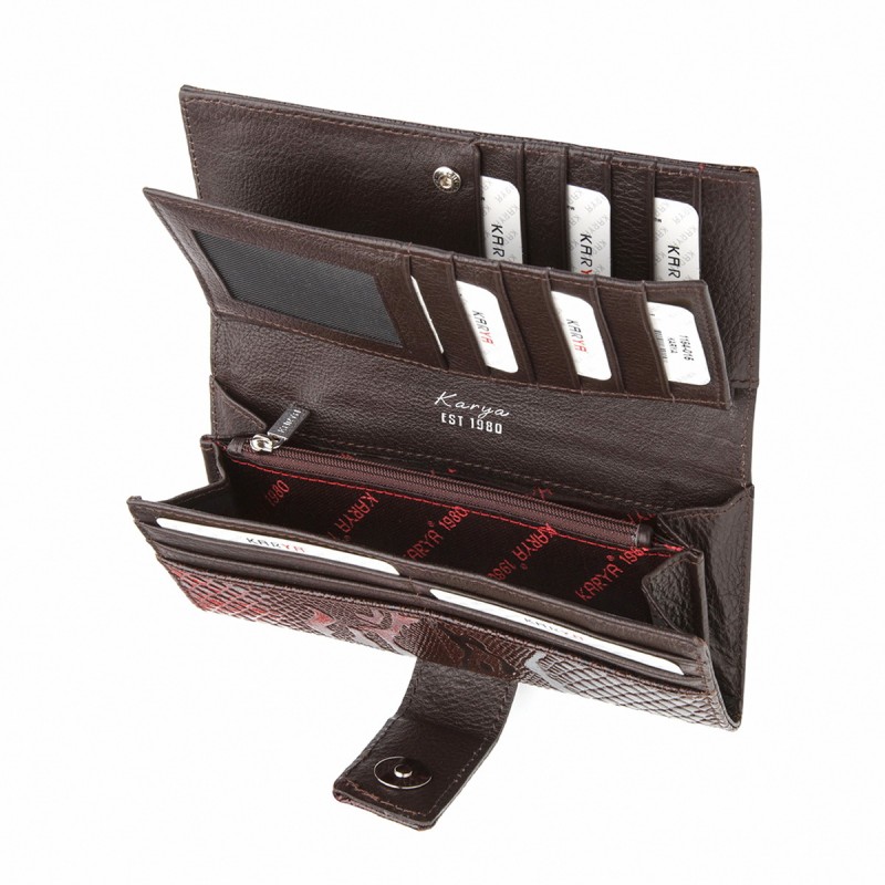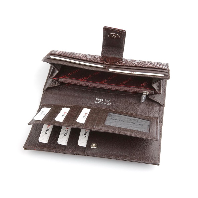 Основной отдел закрывается клапаном на кнопку магнит. Внутри: 3 отделения для купюр, 1 отдел для монет на молнии, 12 отделений (одно сетчатое) для банковских или дисконтных карт, дополнительный отдел – 6 отделений для банковских карт, потайной карман, большой сетчатый карман. Снаружи, с обратной стороны отдел на молнии. Упаковано в подарочную коробку и фирменный пакет Karya.