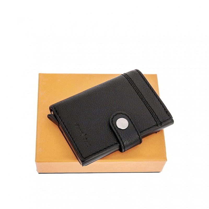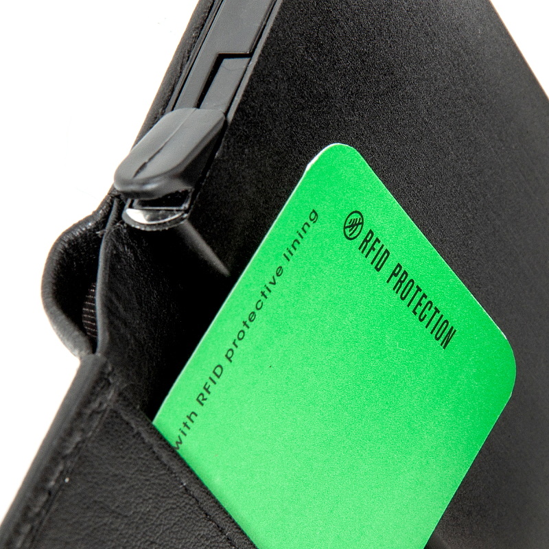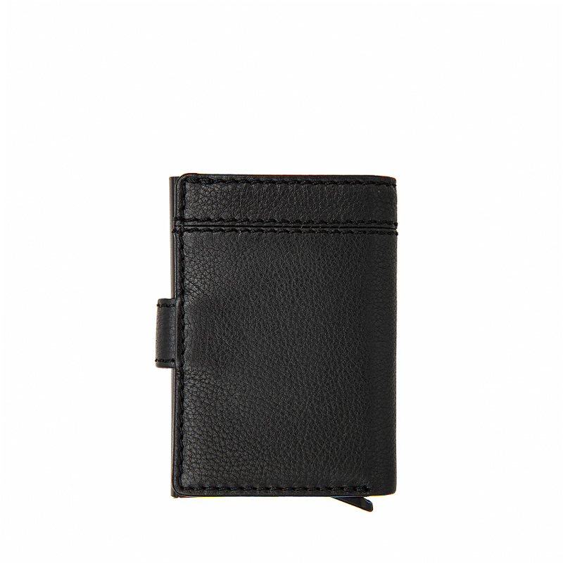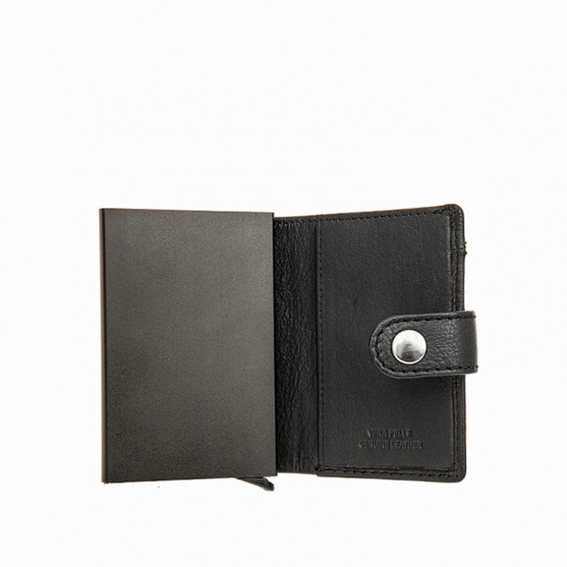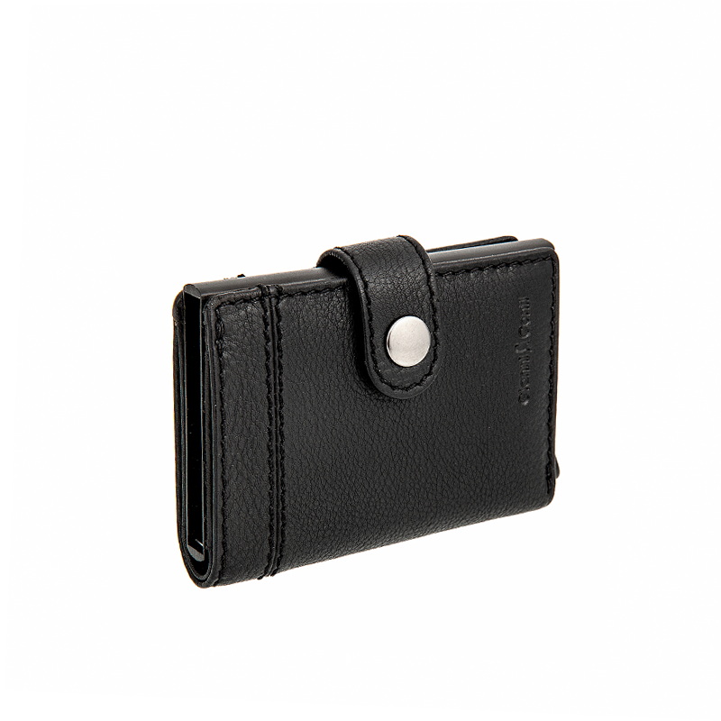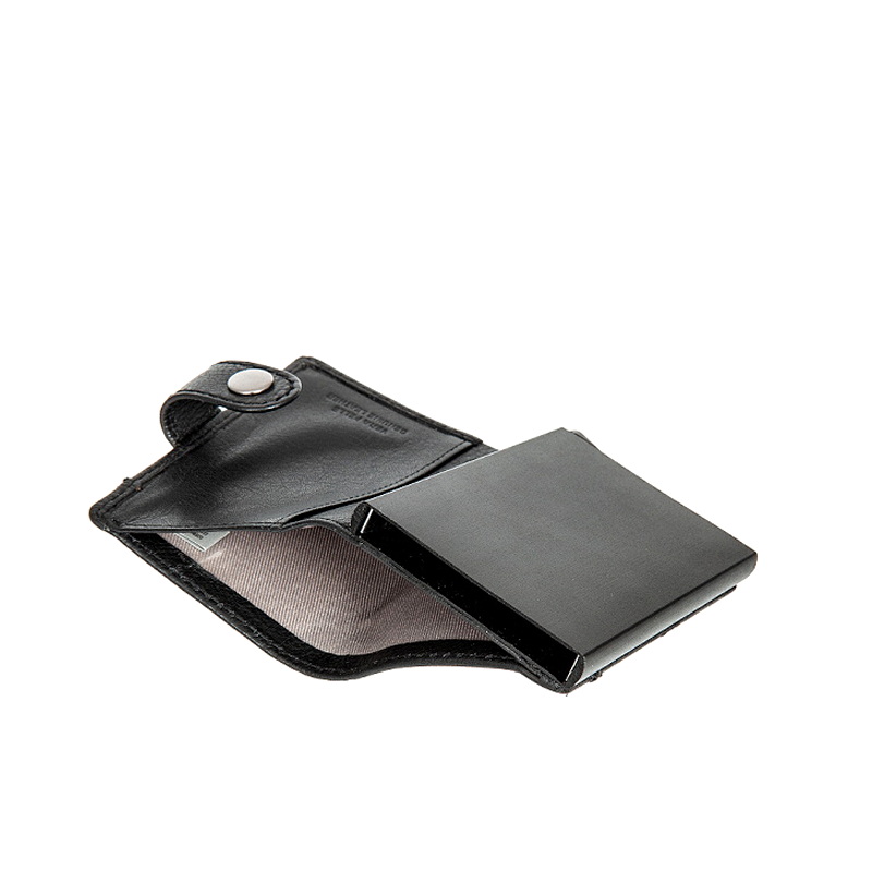 • Картхолдер закрывается клапаном на кнопку. Внутри отделение для купюр, одно внутреннее отделение, металлический блок для хранения визитных, банковских или дисконтных карт с механическим рычажным толкателем для их извлечения. Наличие RFID Protection (защита от считывания данных с банковских карт).