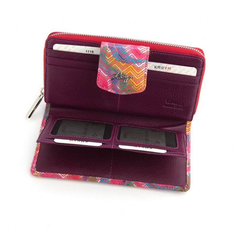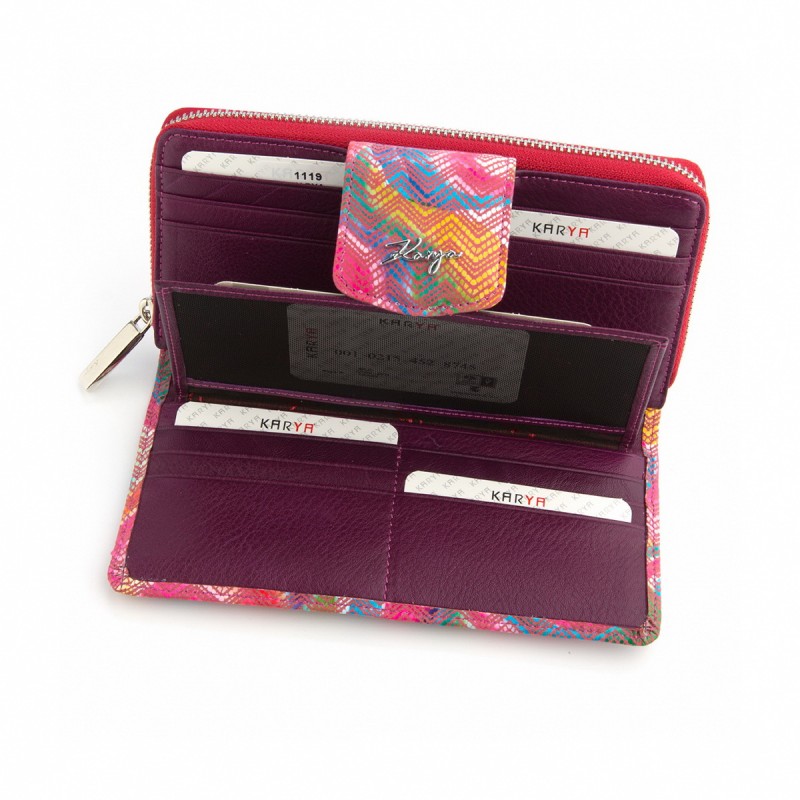 • Основной отдел на молнии, внутри: 3 отделения для купюр, отделение для монет на молнии. Второй отдел закрывается клапаном на магнитной кнопке, внутри: 12 слотов для банковских или дисконтных карт, большой и два маленьких сетчатых кармана, потайной отдел. Упаковано в подарочную коробку и фирменный пакет Karya.