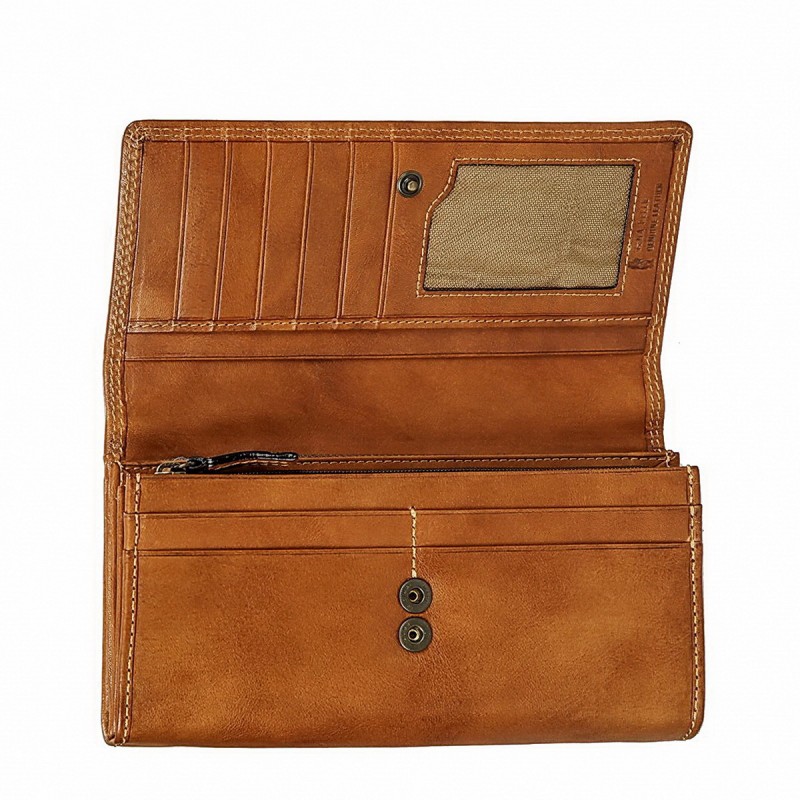 Бумажник-кошелек большого размера. Закрывается клапаном на двойной кнопке, внутри три отдела для купюр, пять отделов для документов (два из них на молнии), двойное отделение для монет на молнии, два кармашка для мелких предметов, девять слотов для банковских карт, сетчатый кармашек, снаружи на задней стенке отделение закрывается клапаном на кнопке, внутри два кармана для документов, двенадцать кармашков для пластиковых карт, сетчатый кармашек.