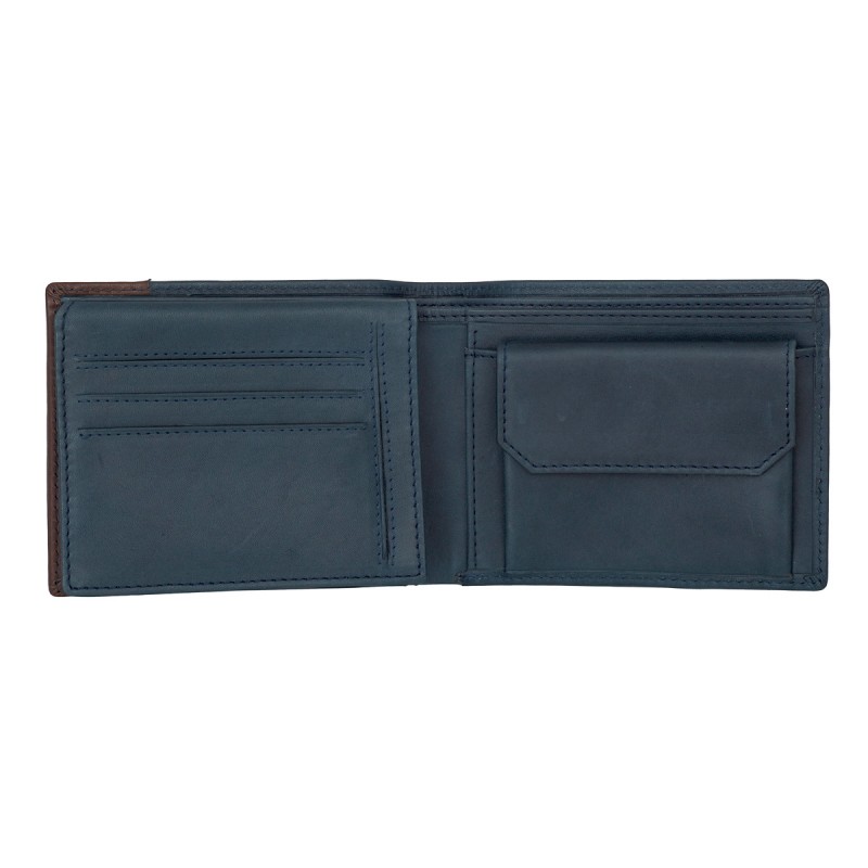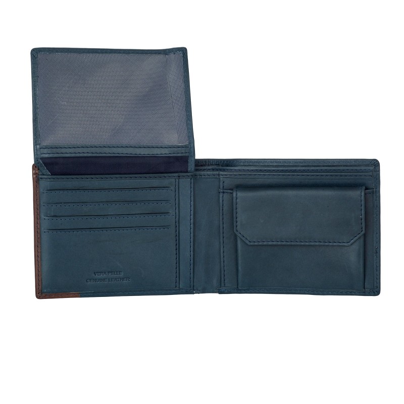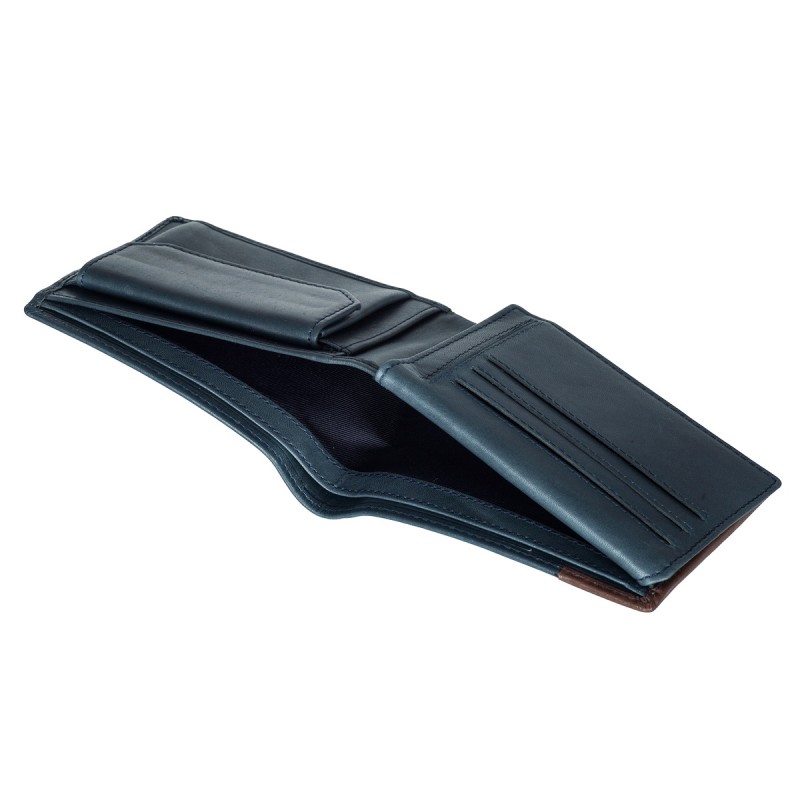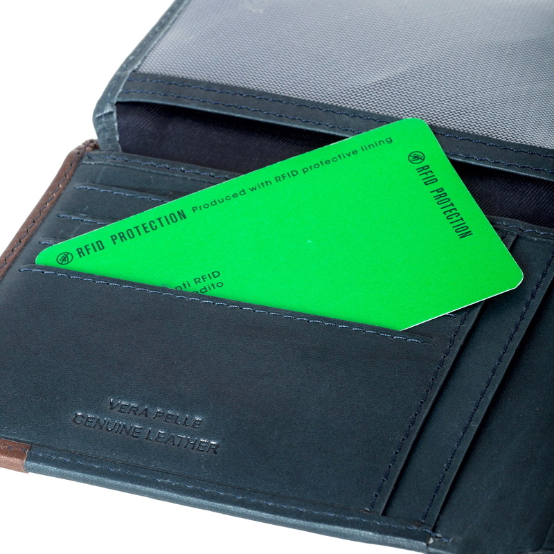 Портмоне из натуральной кожи. Раскладывается пополам, внутри два отдела для купюр, отделение для монет на кнопке, три потайных кармана, восемь слотов для банковских или дисконтных карт, сетчатый карман. Наличие RFID Protection (защита от считывания данных с банковских карт).