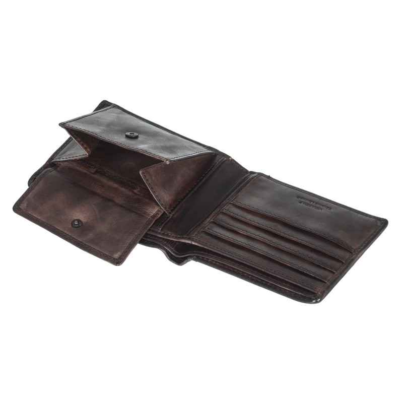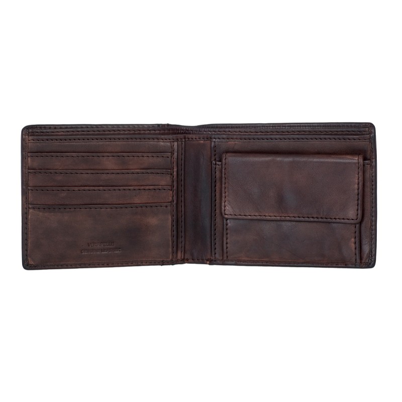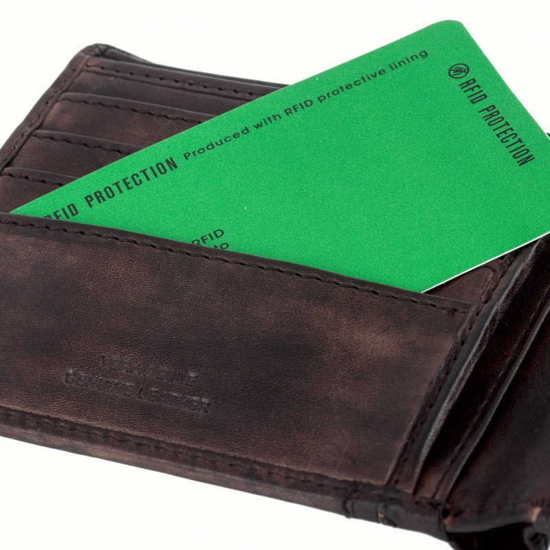 • Портмоне из натуральной кожи в винтажном стиле. Раскладывается пополам, внутри два отдела для купюр, отделение для монет на кнопке, три кармана для документов, четыре отделения для банковских или дисконтных карт. Наличие RFID Protection (защита от считывания данных с банковских карт).