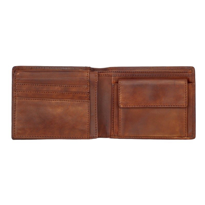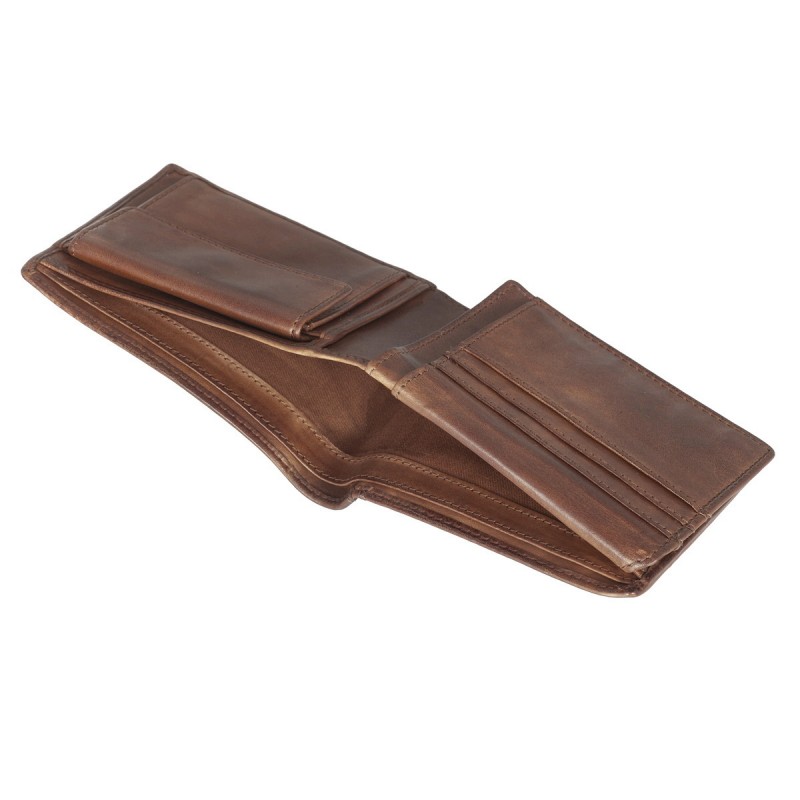 - Портмоне из натуральной кожи в винтажном стиле. Раскладывается пополам, внутри два отдела для купюр, отделение для монет на кнопке, четыре кармана для документов, семь отделений для банковских или дисконтных карт, сетчатый отдел. Наличие RFID Protection (защита от считывания данных с банковских карт).