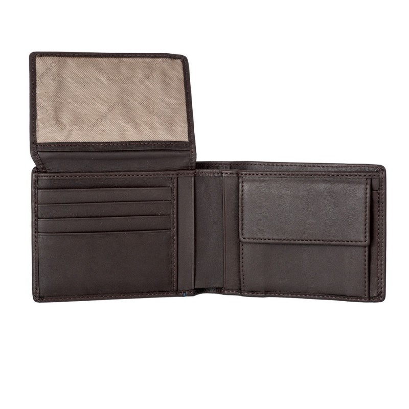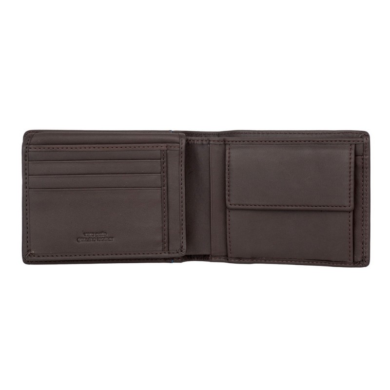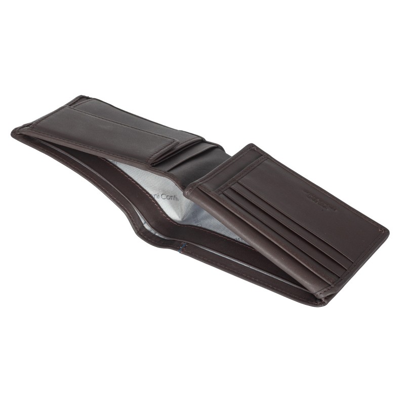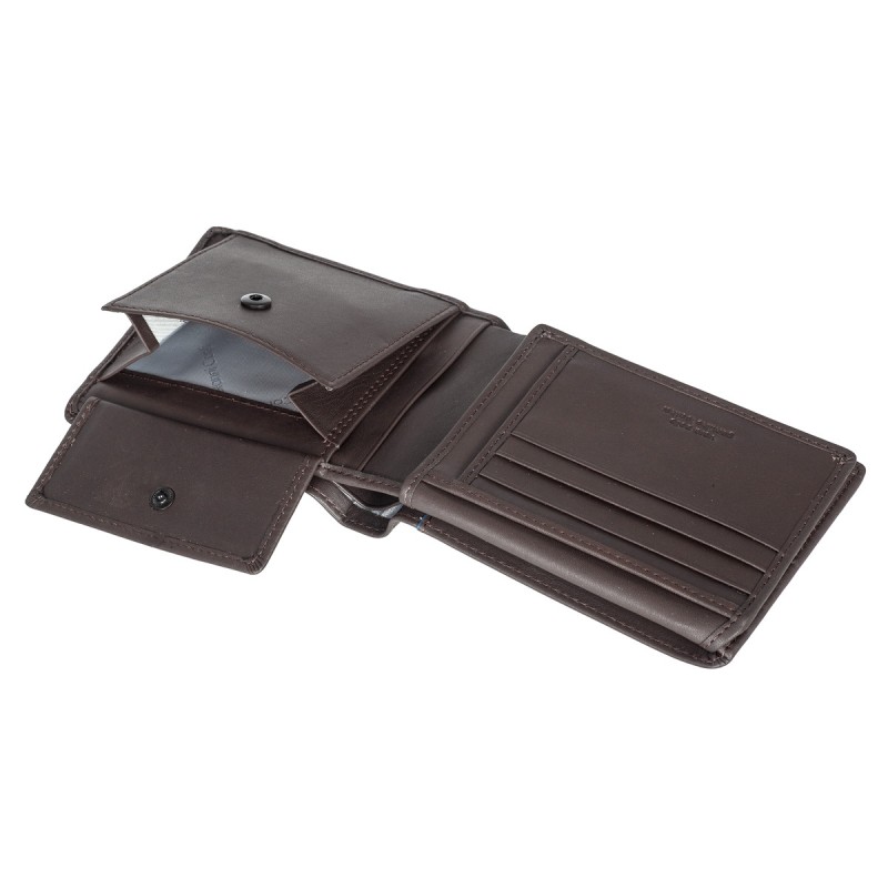 • Портмоне из мягкой, матовой натуральной кожи. Раскладывается пополам, внутри два отдела для купюр, отделение для монет на кнопке, четыре потайных кармана, восемь слотов для банковских или дисконтных карт, сетчатый отдел, снаружи, на лицевой стороне карман быстрого доступа. Наличие RFID Protection (защита от считывания данных с банковских карт).