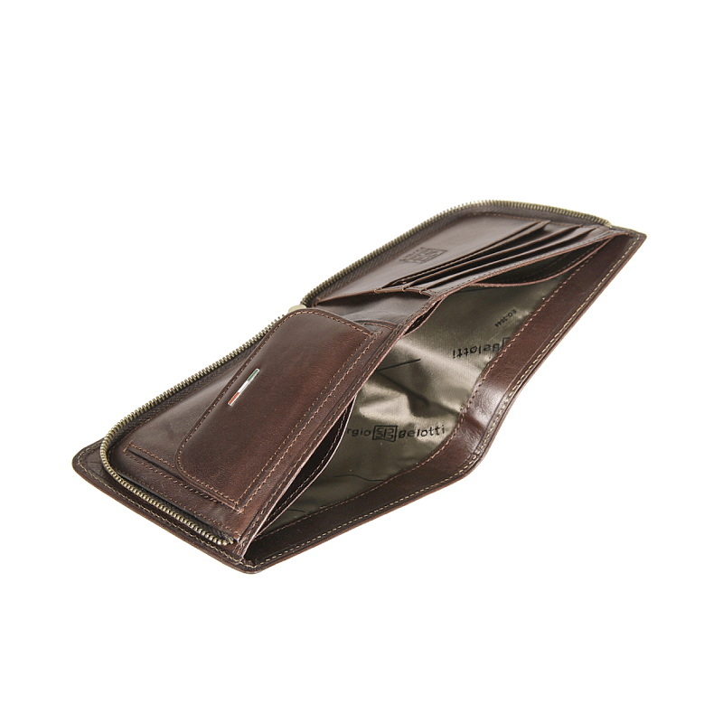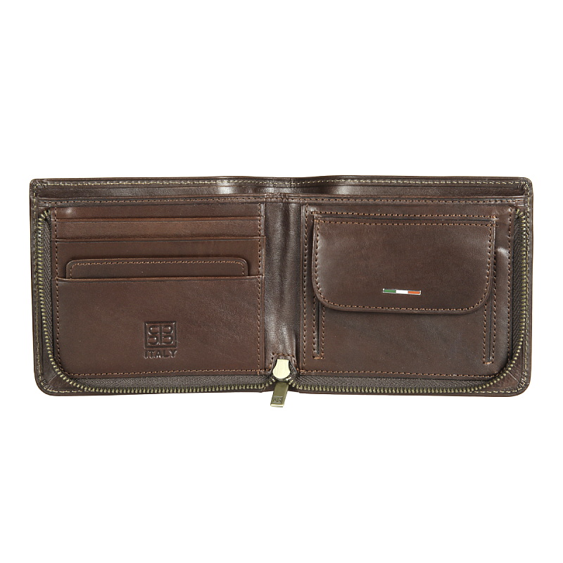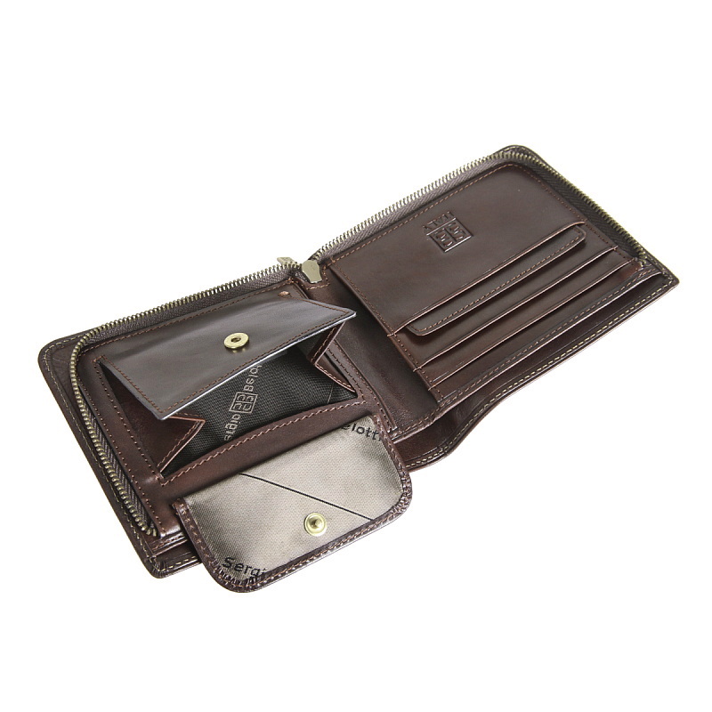 • Раскладывается пополам, закрывается по периметру на молниювнутри два отдела для купюротделение для монет на кнопкедва потайных кармана, четыре слота для банковских или дисконтных карт