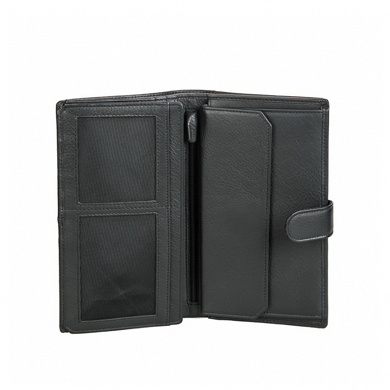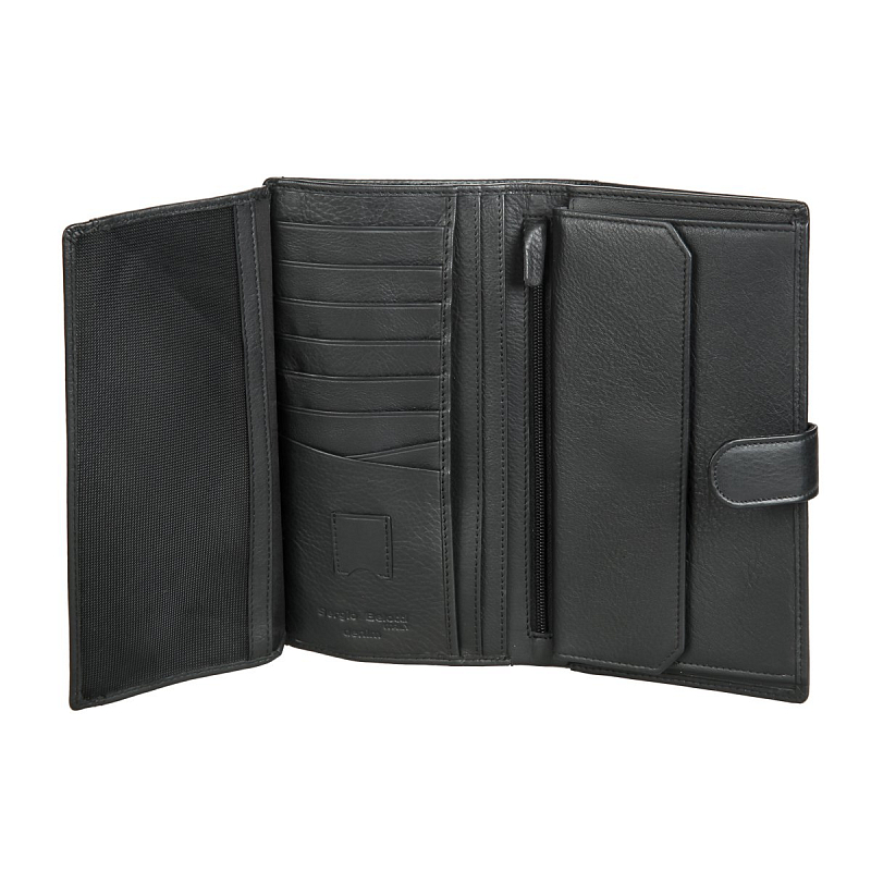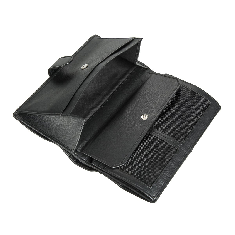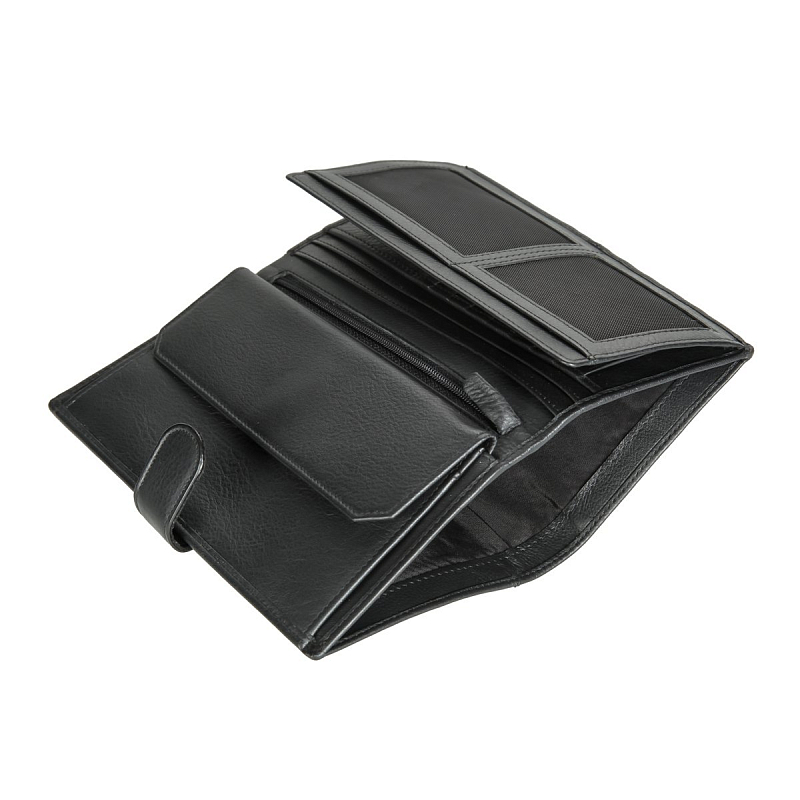 • Бумажник большого размера. Закрывается клапаном на кнопке, внутри отдел для купюр, двойной отдел для монет на кнопке, четыре отдела для документов (один сетчатый), потайной отдел  на молнии, два сетчатых кармана, восемь слотов для банковских или дисконтных карт.
