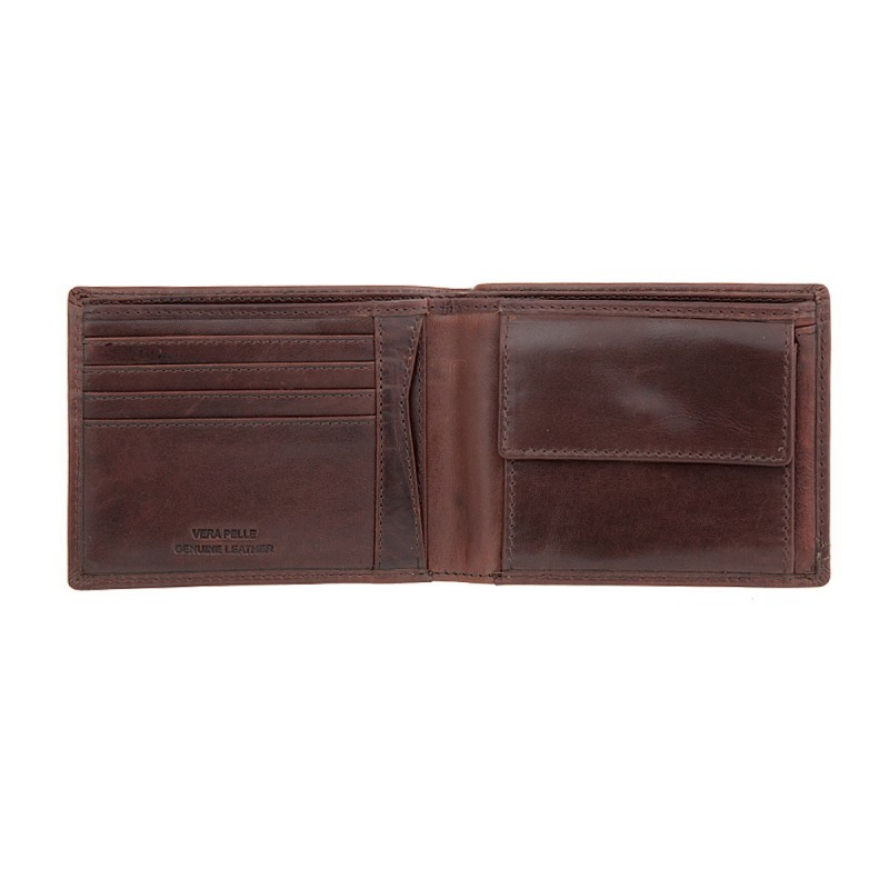 Раскладывается пополам, внутри два отдела для купюр, карман для монет на кнопке, четыре отделения для банковских или дисконтных карт, три кармана для документов. Наличие RFID Protection (защита от считывания данных с банковских карт).