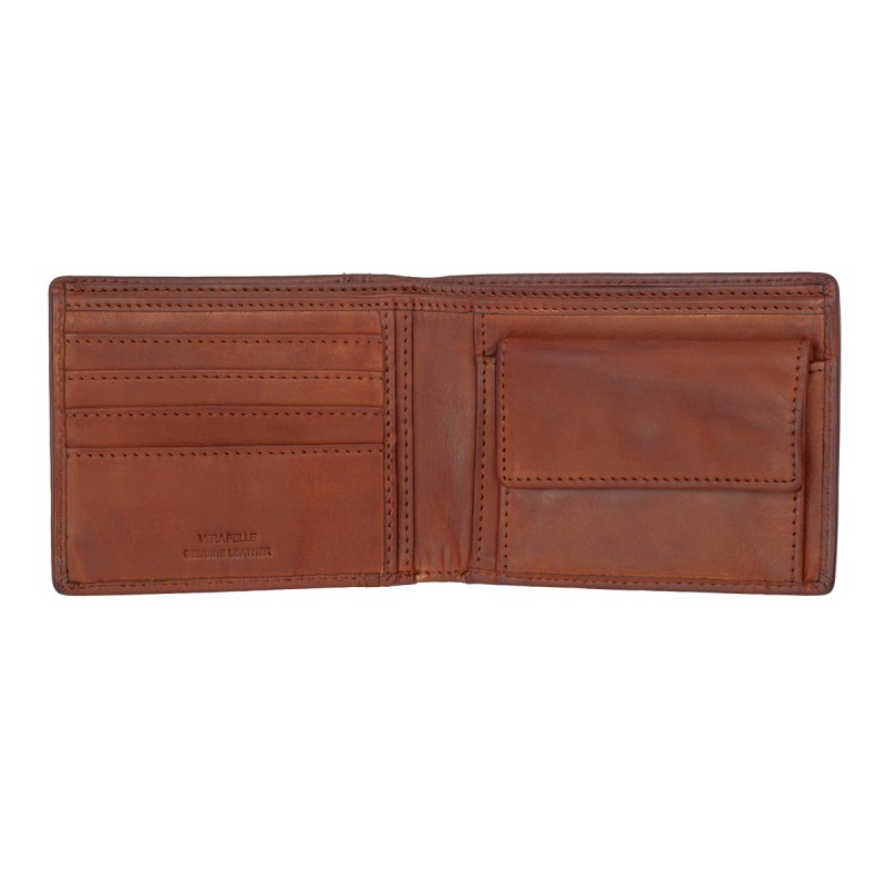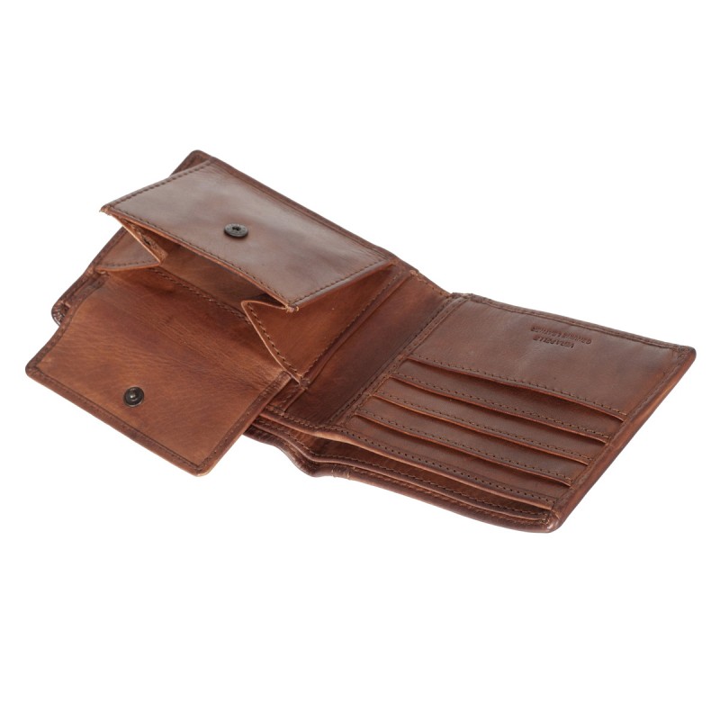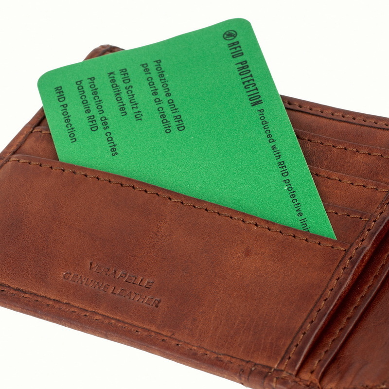 • Портмоне из натуральной кожи в винтажном стиле. Раскладывается пополам, внутри два отдела для купюр, отделение для монет на кнопке, три кармана для документов, четыре отделения для банковских или дисконтных карт. Наличие RFID Protection (защита от считывания данных с банковских карт).