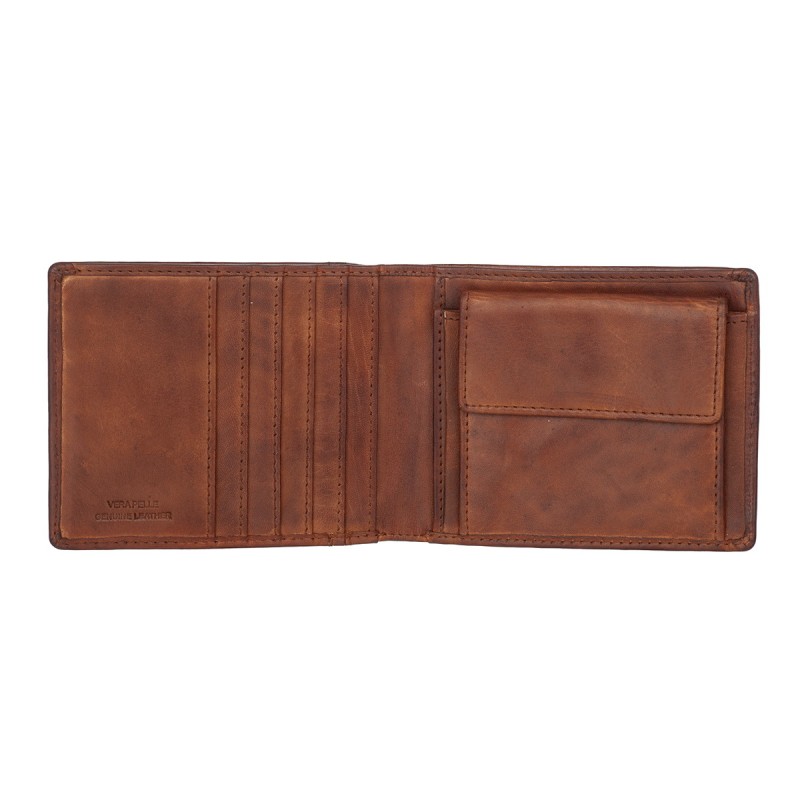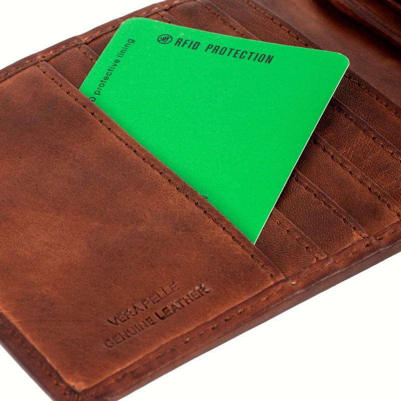 • Портмоне из натуральной кожи в винтажном стиле. Раскладывается пополам, внутри два отдела для купюр, отделение для монет на кнопке, два кармана для документов, пять отделений для банковских или дисконтных карт. Наличие RFID Protection (защита от считывания данных с банковских карт).