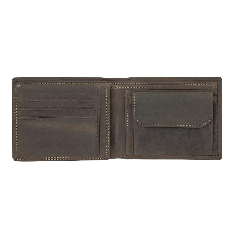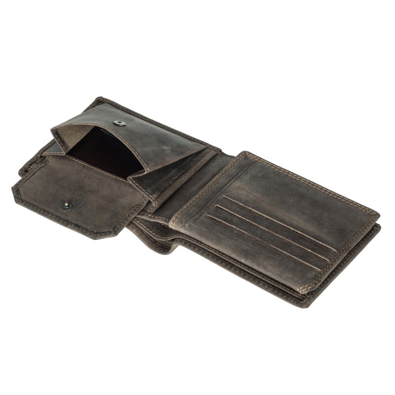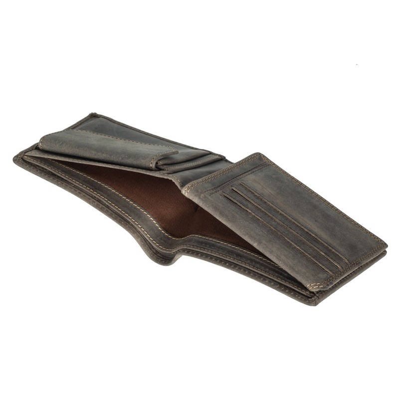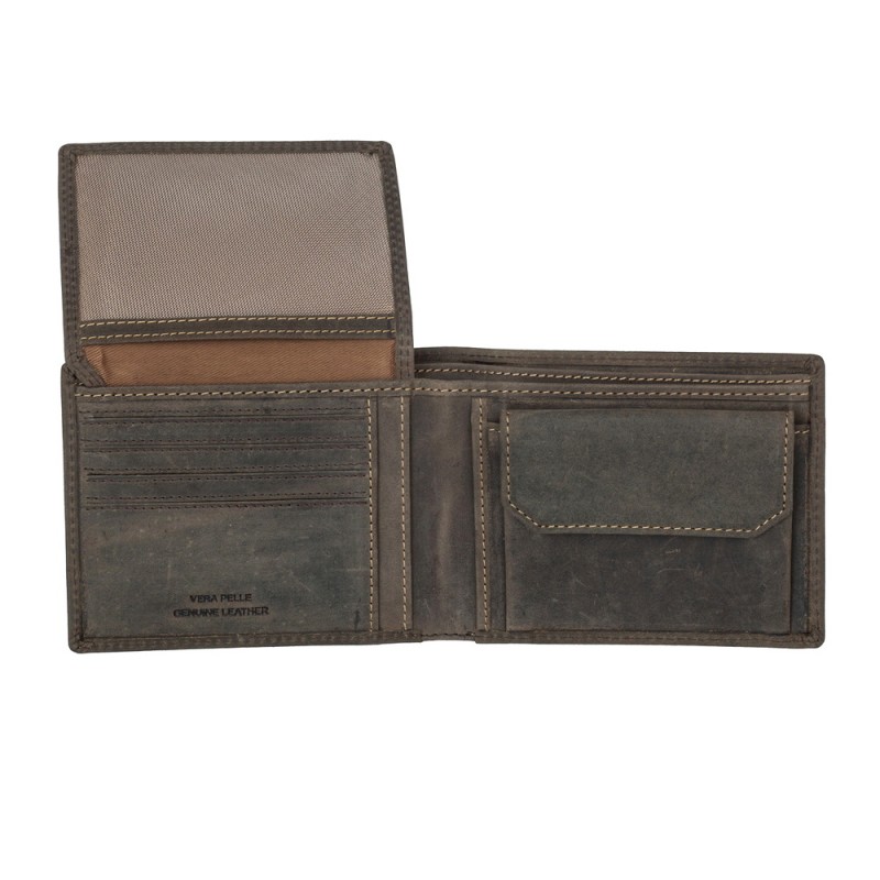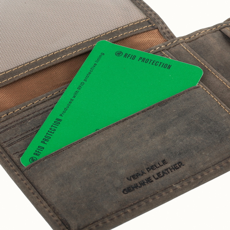 • Портмоне из натуральной замши. Раскладывается пополам, внутри два отдела для купюр, отделение для монет на кнопке, три кармана для документов, потайной отдел, семь отделений для банковских или дисконтных карт, сетчатый отдел. Наличие RFID Protection (защита от считывания данных с банковских карт).