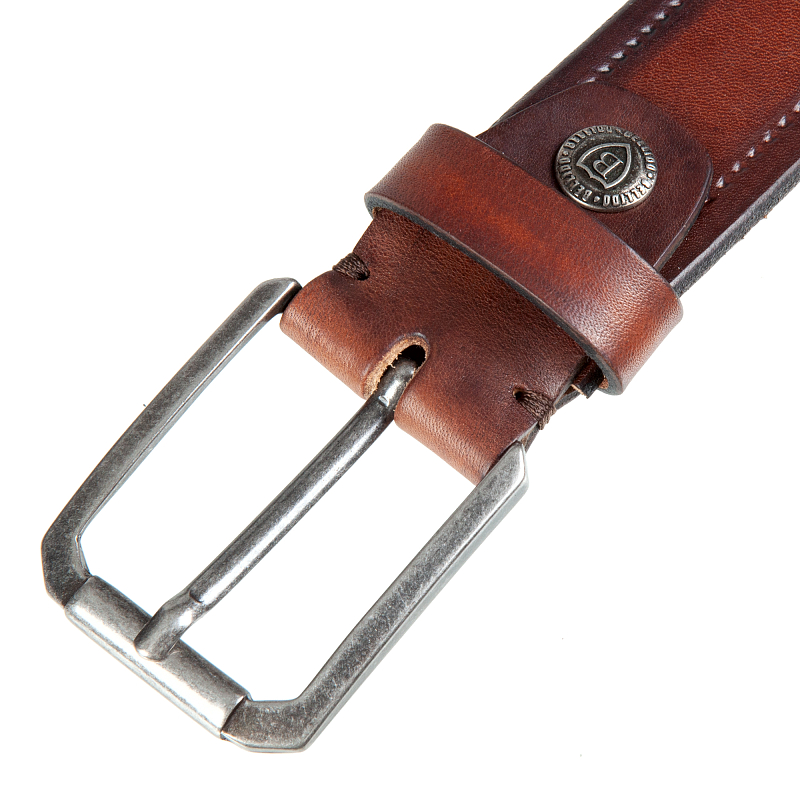 Кожаный джинсовый ремень, изготовлен из высококачественной цельной бычьей кожи. Винтовое крепление для укорачивания, пять отверстий для регулировки. Пряжка 5,5 х 5 см., цвет – серебро антик.
