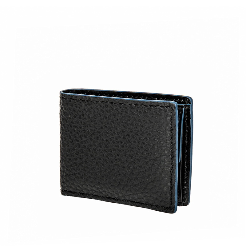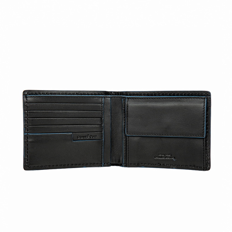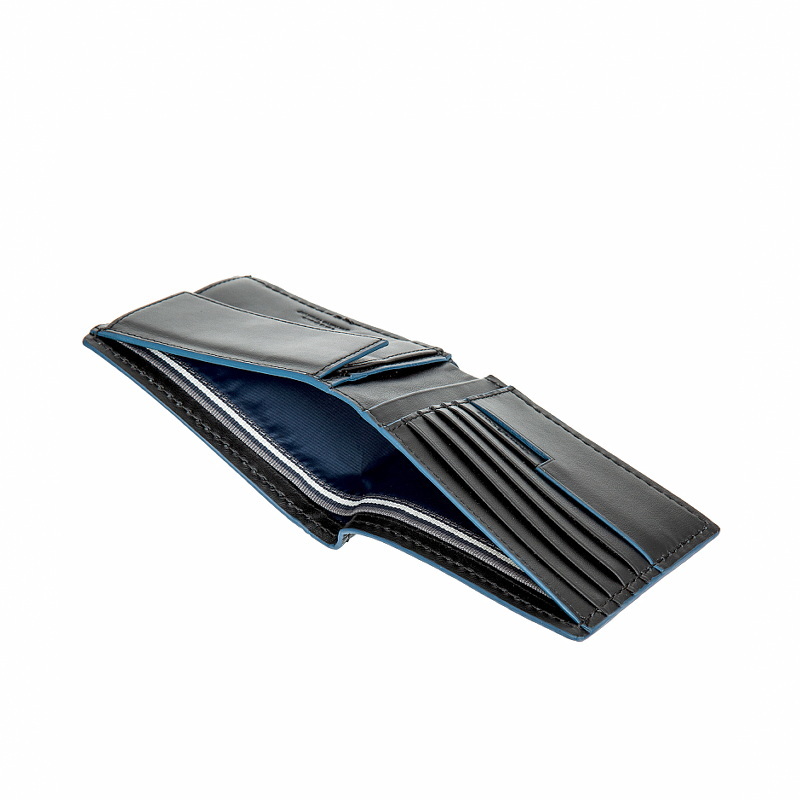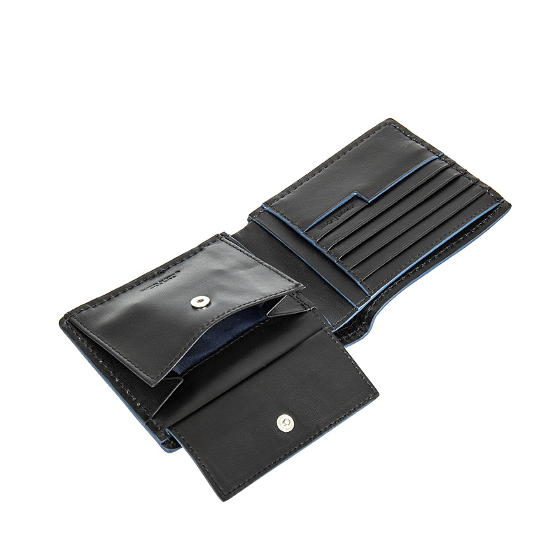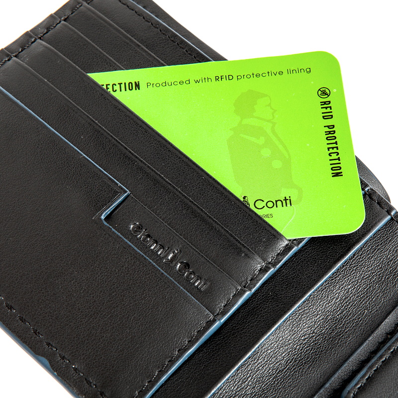 Раскладывается пополам, внутри: два отделения для купюр, карман для монет на кнопке, два потайных кармана, семь отделений для банковских или дисконтных карт. Наличие RFID Protection (защита от считывания данных с банковских карт).