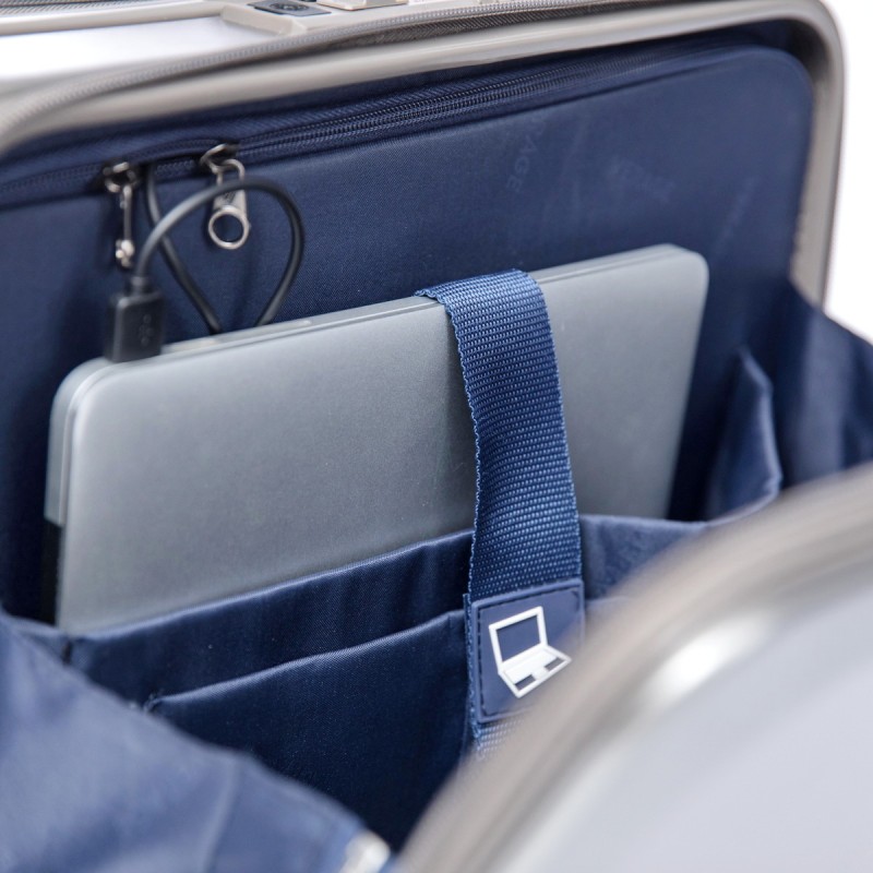 Отдельное бизнес-отделение на лицевой стороне, закрывается на двойной кодовый замок “TSA” (см. фото). Внутри: мягкий отдел для ноутбука, планшета (25х36 см.), отдел для документов (А4), отделы для визиток, документов, авторучек.