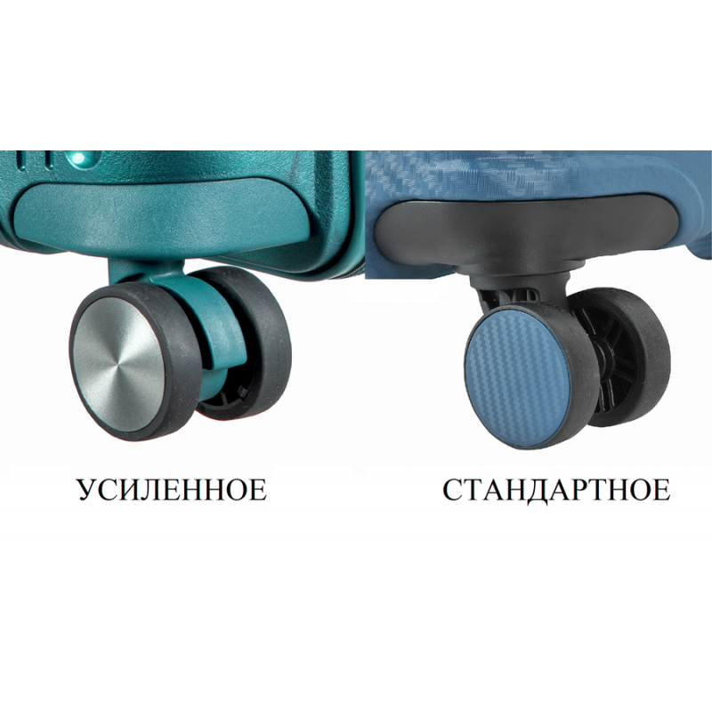 Телескопическая система – с ребрами жесткости, фиксируется в трех положениях, ручки для переноски с эффектом противоскольжения. В нижней части корпуса литые, противоскользящие ручки для переноски чемодана двумя руками. 4 двойных, усиленных колеса с покрытием из термополиуретана.