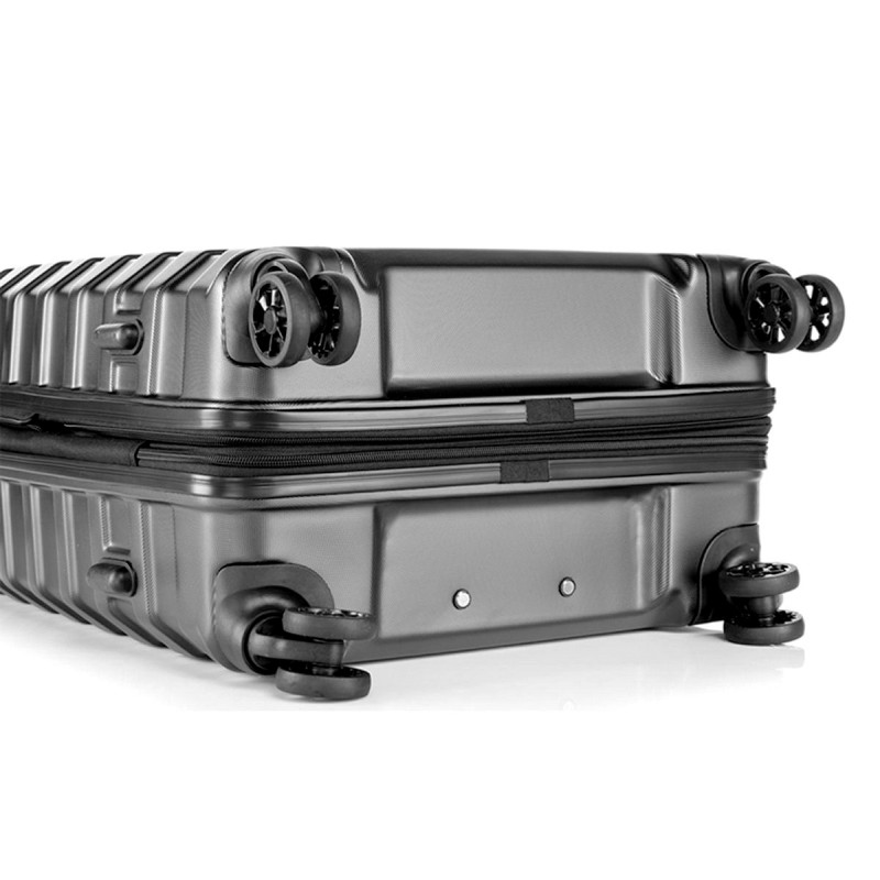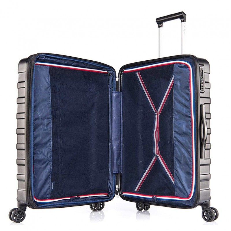 Телескопическая система выдвижной ручки – с ребрами жесткости, фиксируется в трех положениях, двойные бесшумные колеса оборотом 360°. Диаметр колес увеличен до 5,7 см.. Площадка нижней части корпуса в виде ручки, для переноса чемодана двумя руками. Встроенный кодовый замок с функцией "TSA" (досмотр багажа службой безопасности без повреждения чемодана).